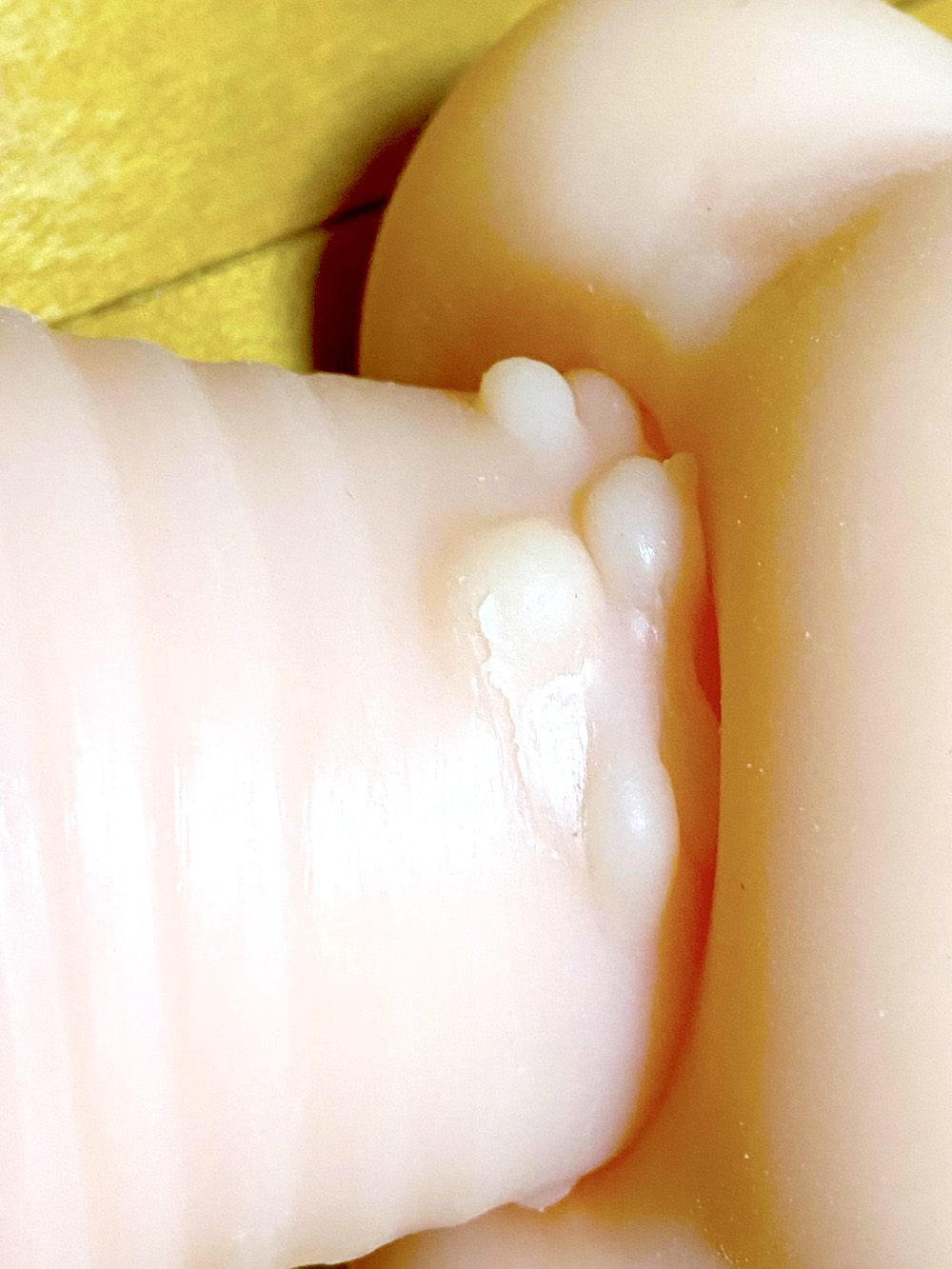 でも、そこはグッとガマンして開封の儀。まず驚くのは造形です。オナホの外面にはオッパイだけでなく、おち◯ちんとタマタマまでしっかり造形されている。これから購入を考えている方は、よく見て下さい。このおち◯ちんとタマタマの造形を。なんて、可愛くエロいのでしょう。元来、おち◯ぽ>おま◯こなワタクシは、これだけでもう悶絶寸前です。