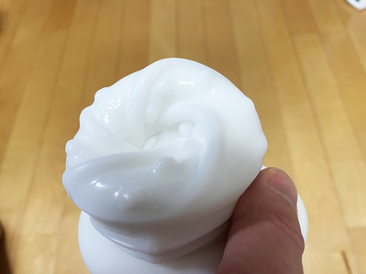 こうして触っている時に気づいたのは、もうひとつ。すごく吸い付くようにできているのである。オナホ本体を手に取り握ったり開いたりしてみると、まだローションを注入していないのに水に濡れたようなグッチャグッチャという音がする。あれだ、美しょゲーなどでも使われている挿入してから動いている時にする効果音。あれみたいな音がまだなにも使っていないのにするのだ。素材のセレクトによるものか、内部構造によるものか。とにかくチ◯ポへの密着度の高さが期待できそうだ。