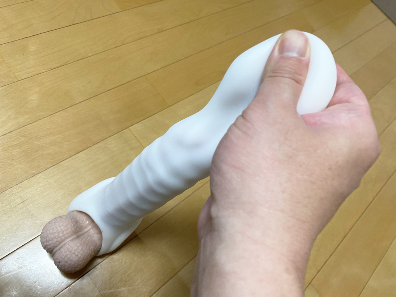 では、いよいよ試してみることにしよう。今回、このオナホで期待したのはキンタマにホールドすることで抜けにくくするという工夫。これ、普段から貞操帯装着してセルフ射精管理とかを楽しんでいる筆者としては、期待が止まない部分である。