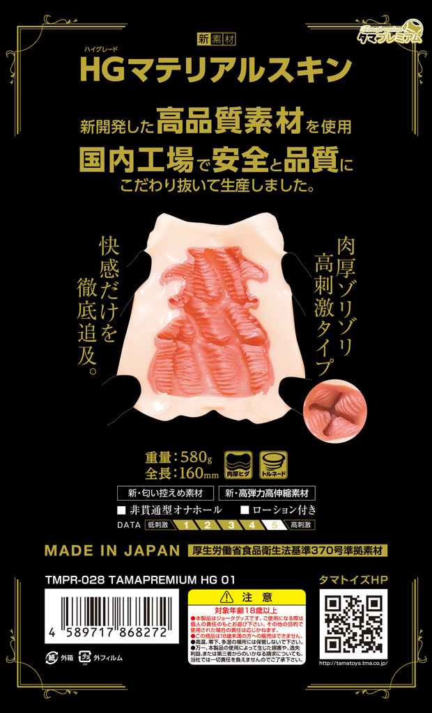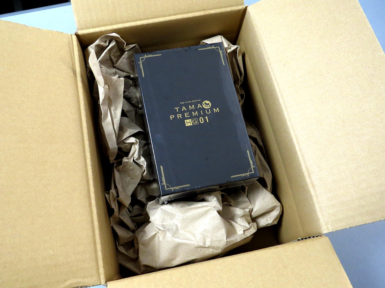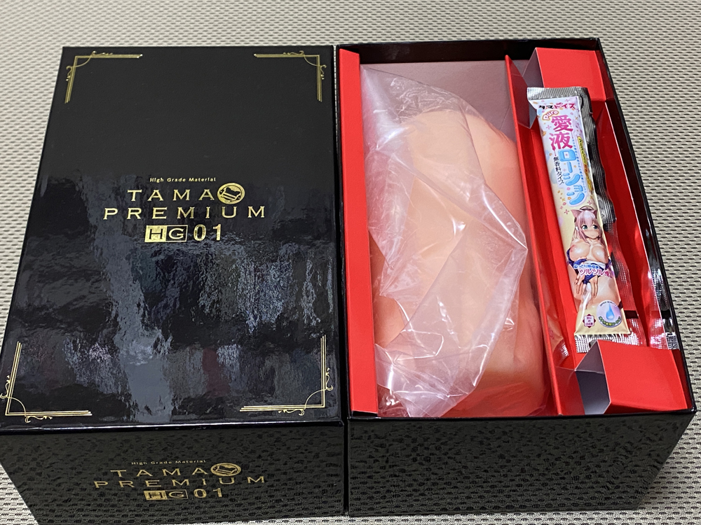 箱の中から出てきたのは、高級感溢れる漆黒の箱。まるで高級ウイスキーのような佇まいだ。およそオナホらしからぬパッケージだが、本当にタマトイズなのか…? と確認してみると、箱には金色で「TAMAPREMIUM HG 01」の文字が。プレミアムかつ「HG」とはいったいどういうことなんだ。毎月、アイデアと技術の限界に挑戦したような新作をリリースしているタマトイズなのに、そのさらに上をいくアイテムだというのか?