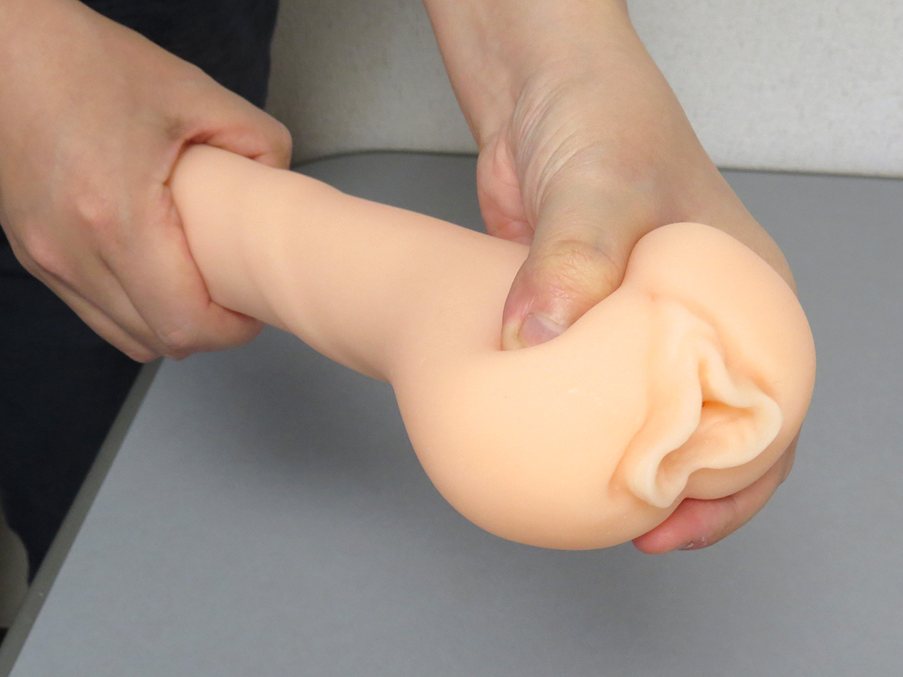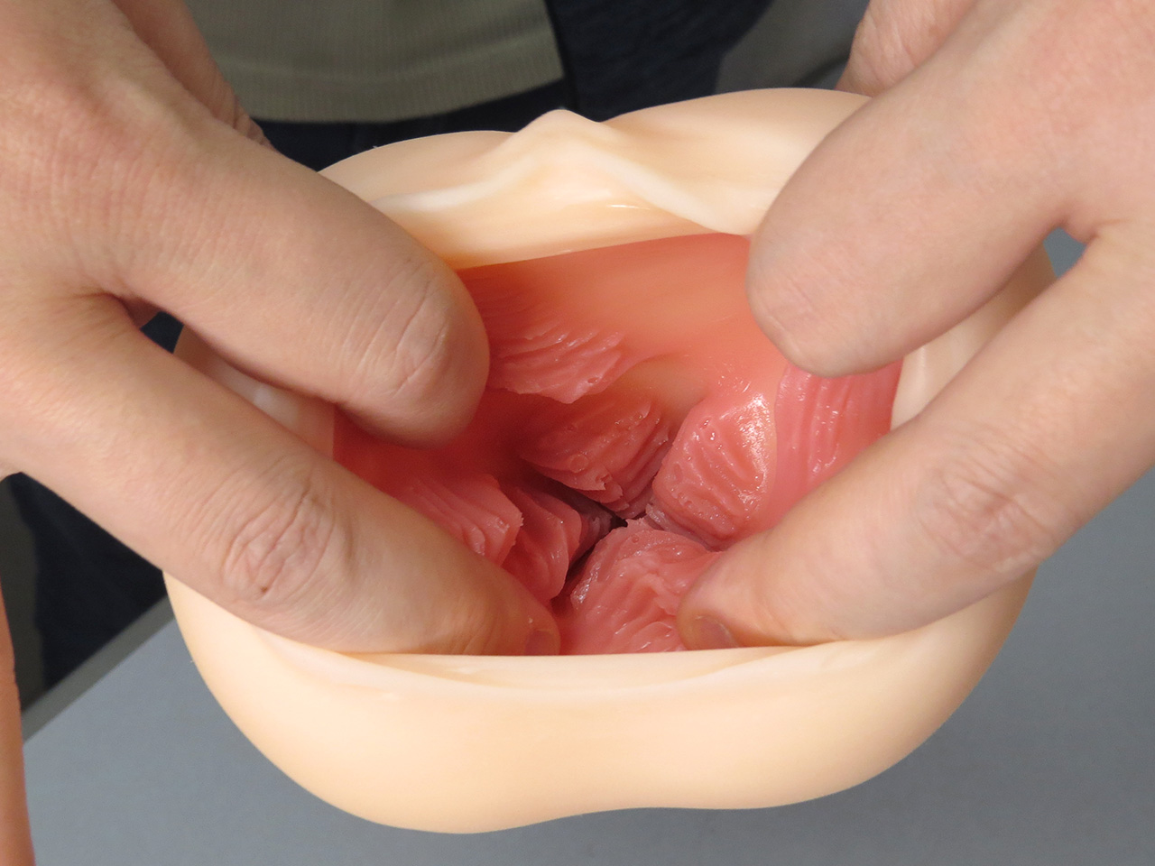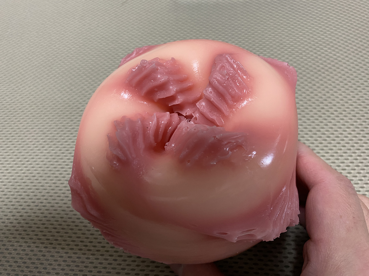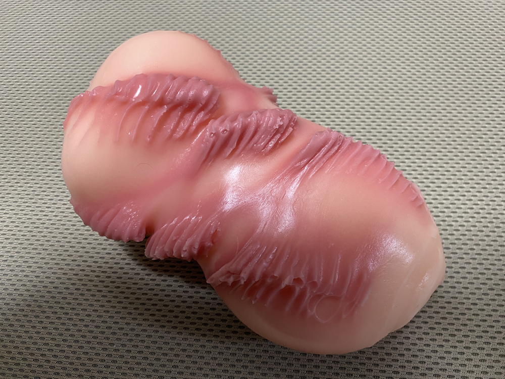 説明文に「新・高弾力高伸縮素材」とあるように、肉厚でガッシリした分、弾力が凄く感じられた。吸い付いたりまとわりついたりというよりも、高刺激に期待できそうだ。しかし弾力性が高いからといって、柔らかく無い訳ではもちろん無い。その証拠に、やたらエロくビラビラが造形された膣穴に指を突っ込んだら、余裕で3本も飲み込んでくれた。