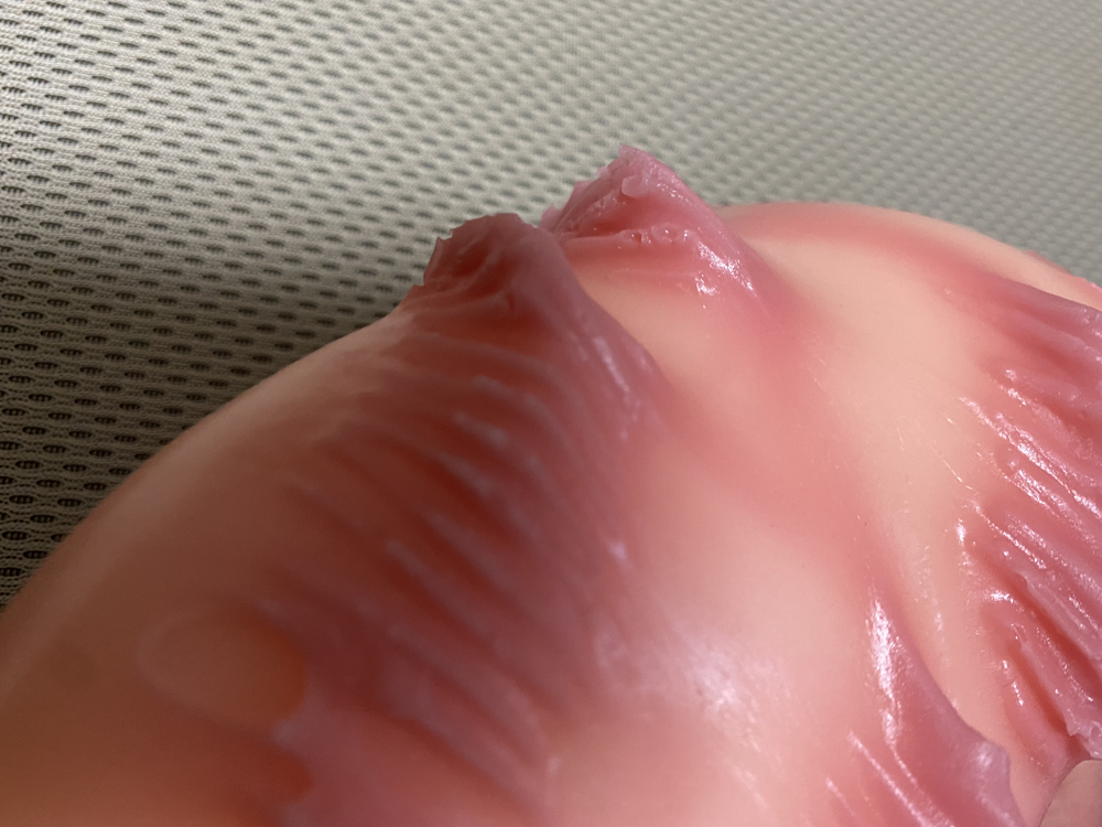 膣口部分は大きめになっていて、普通にしていてもクッポリと空いた穴の中から、奥のヒダがかすかに目視できる。このヒダヒダが濃厚な色遣いになっており、しかもイソギンチャクかなんかのように待ち構えているではないか。今一度パッケージの説明文を見ると、中身については「肉厚ゾリゾリ高刺激タイプ」「快感だけを徹底追及」との文字が。まさに肉厚ゾリゾリ…HGな高刺激の快感に、期待が高まる。