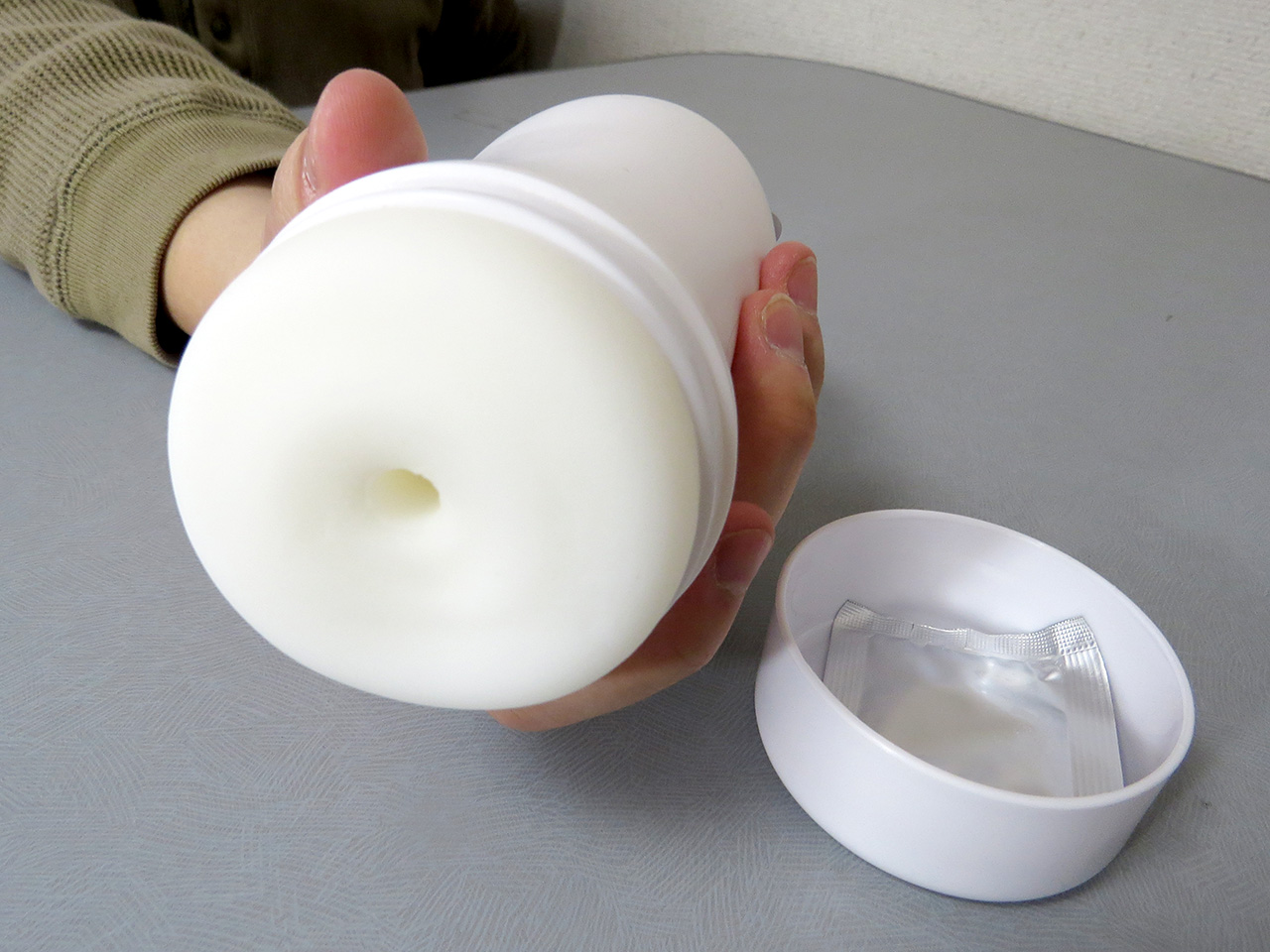 オナホ部分はこんな感じでカップになっており、蓋を開けると白いオナホが登場する。同梱されているオナホは非常に柔らかく伸縮性があるが、カップでホールドされているおかげで、扱いづらいという事はなかった。内部は突起が多く、刺激が強めの作りになっている。なのでこのままでも十分快感が味わえそうだ。