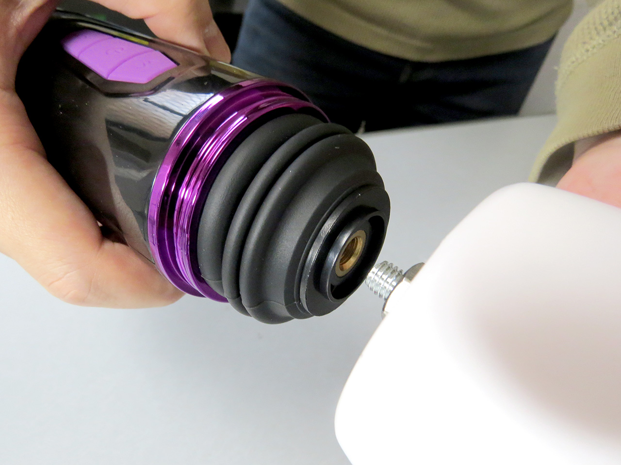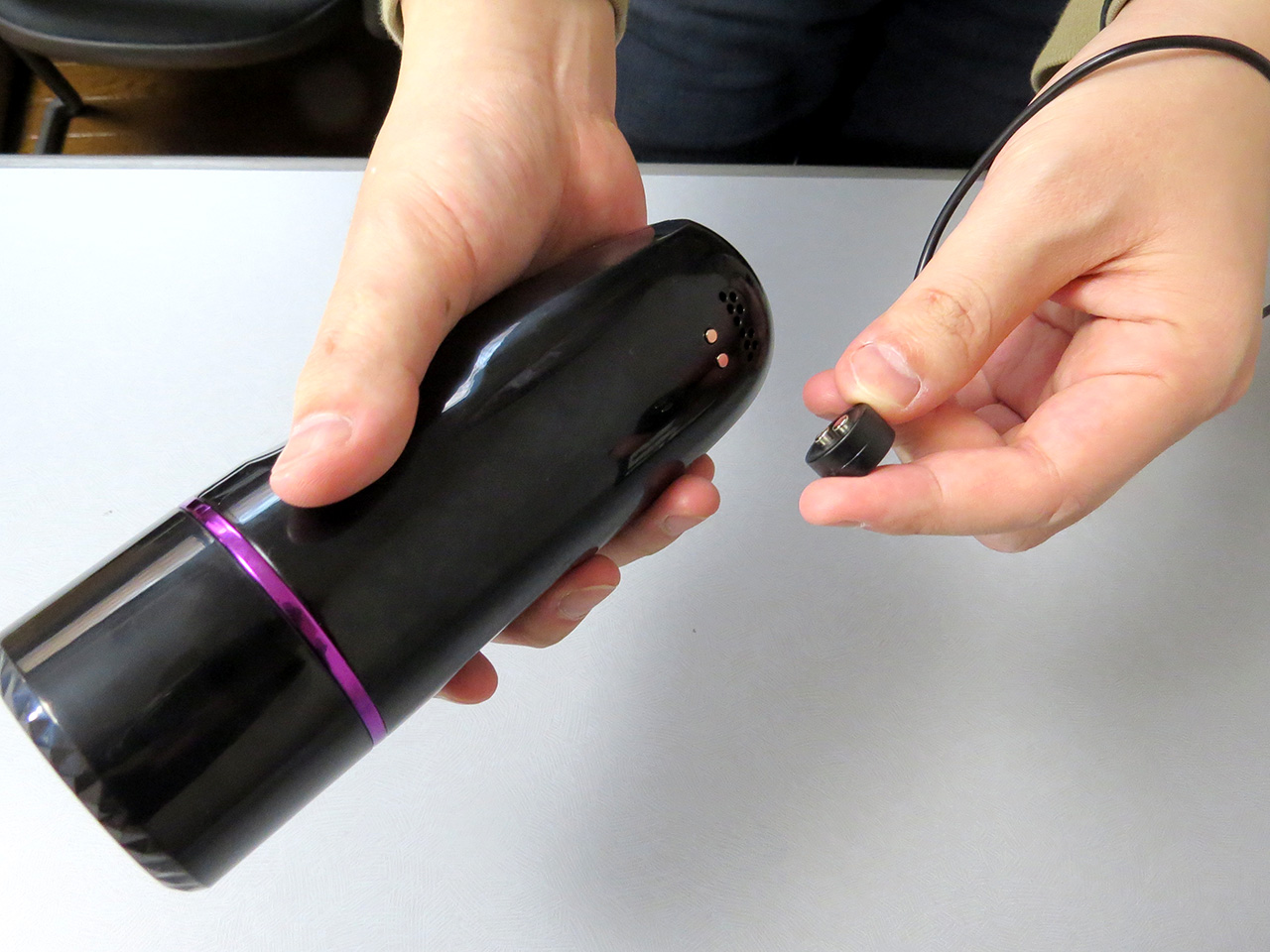 では、本体を検証していこう。まずは電動オナホの「電動」部分をチェック。手の平にスッポリ収まるそのアイテム・本体部分は、アダルトグッズでゃなく美容器具といったオシャレな雰囲気。側面には紫のスイッチボタンが。そして上部は蓋が付いており、これを開けると別の部品と接続するためのネジ穴が存在している。
