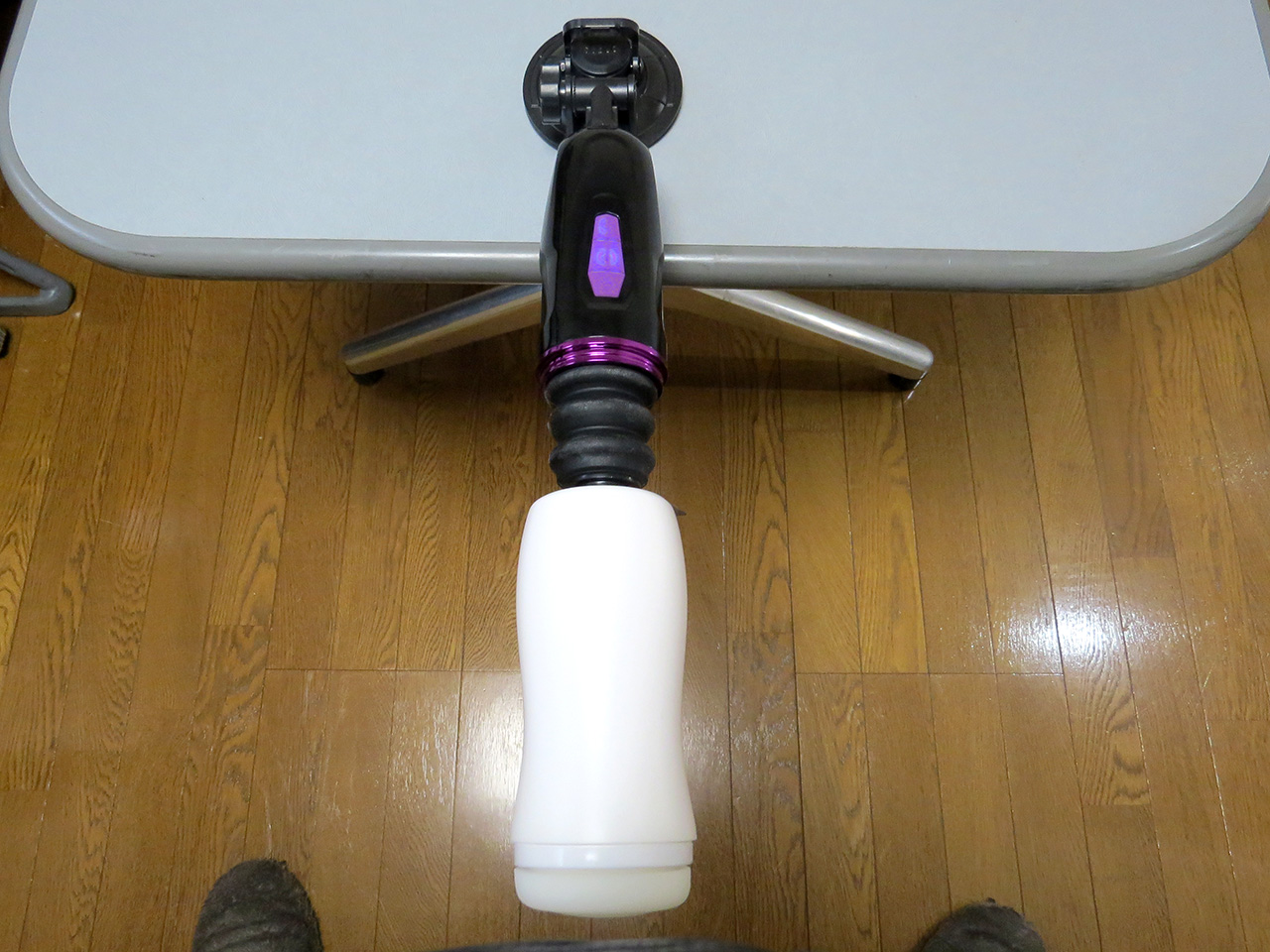 いよいよ3つのアイテムを合体させ、実際にスイッチを入れてみると…。ウイィィーーーンとオナホ部分&本体上部の蛇腹部分が、凄い勢いで上下運動をし始めた!! 動きは凄くパワフルで、超強力高速モーター搭載というのは伊達ではなさそう。しかも単に振動を与えるわけではなく、絶頂へと導く本物の動きがあるのが凄い。それでいて駆動音も大きくない消音設計なので、家族がいても問題なく使用できそうだ。