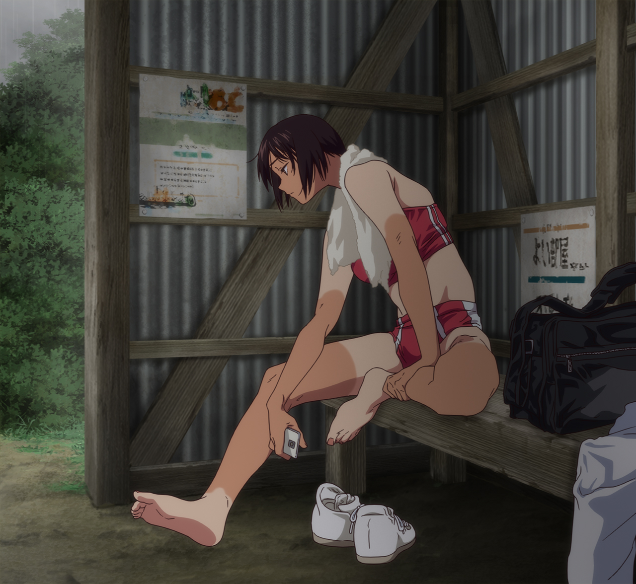 雨が降り頻る人里離れたバス停小屋で一人バスを待つ陸上女子。そこに現れたクライメイトのオタク男子。