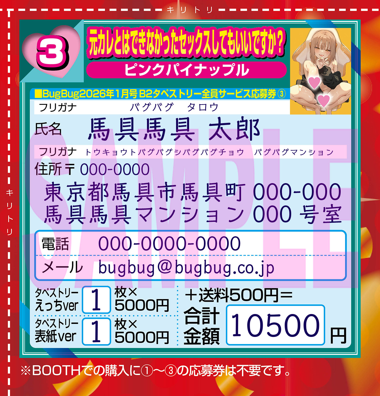 BOOTH・【BugBugショップ】では、その表紙イラストをそのまま使用した「表紙ver」と、すっごくエッチになった差分イラストを使用した「えっちver」、2種類のB2タペストリーを期間限定で予約受付中!! 誌面の応募券と現金書留を使った応募に加え、ネット通販のBOOTH【BugBugショップ】でも注文を受付ているぞ。