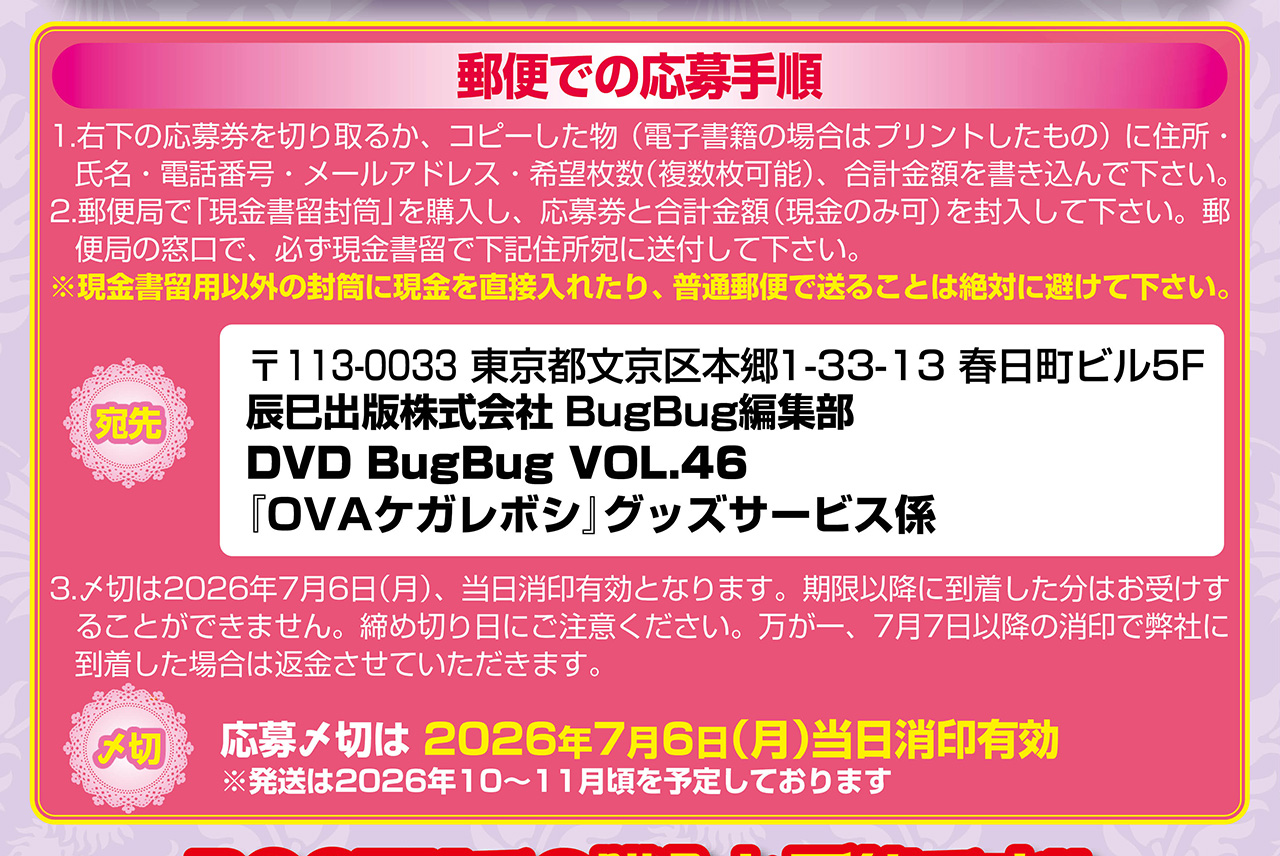 『DVD BugBug』VOL.46と『BugBug』5月号の誌面に付いた応募券を現金書留に入れて送る応募方法も絶賛受付中!!