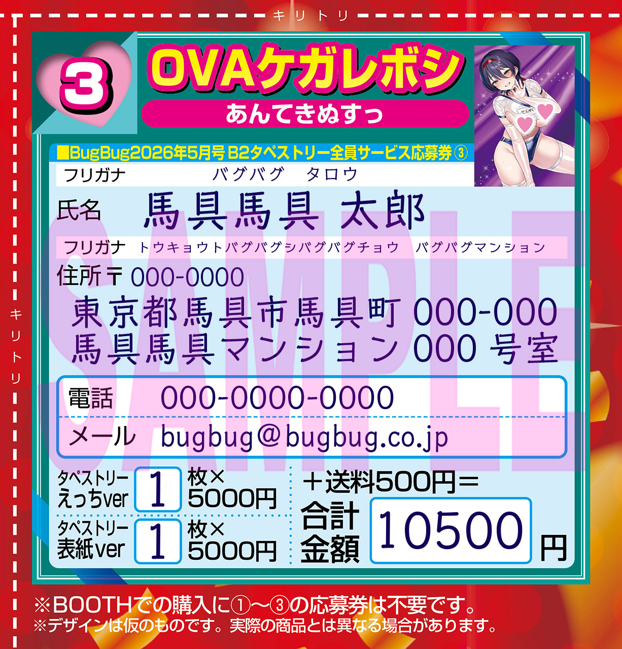 ▲こちらは絶賛発売中な『BugBug』本誌5月号(4/3発売)の74ページに付いている応募券の、「表紙ver」と「えっちver」を各1枚ずつ申し込んだ場合の記入例。他にも『ムジナ・臭』(TinkerBell)と『誰ソ彼のシェイプシフター』(Liar-soft)のタペストリーの応募券も付いていて同時に応募できるが、受注締切が種類ごとに異なっているので、よく注意して応募しよう