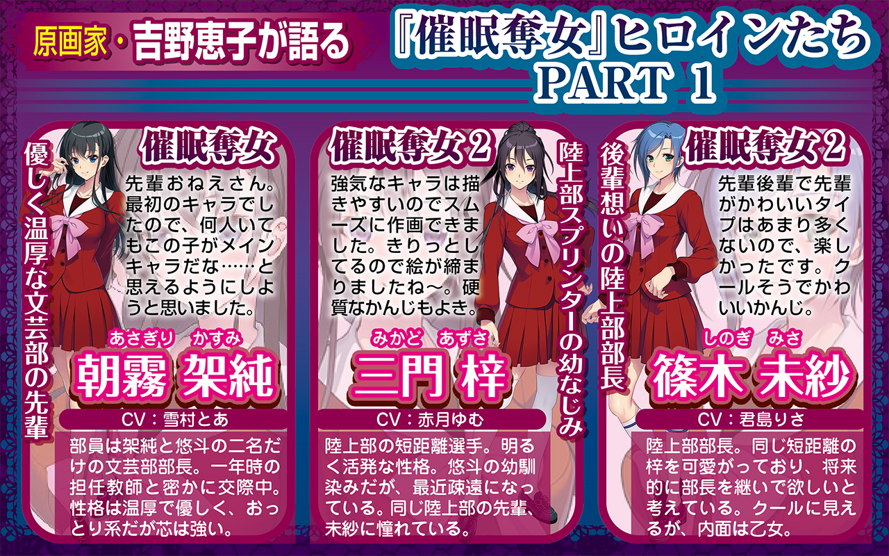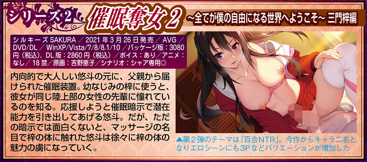 BugBug3月号に掲載されたインタビューはとてもボリュームがあるため今回はシリーズ各作品の紹介部分を中心にお見せしたが、制作する上でどのような指示のやりとりがあったのかとか、シャア専用◎氏の過去にプレイしたゲームや雑誌、吉野恵子氏のミニインタビューとキャラコメントなど、貴重な情報が山盛りなで『催眠奪女』シリーズのファンは必見!! ぜひ本誌で全文をチェックしよう。