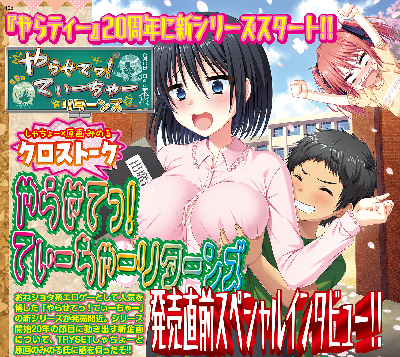 おねショタ系エロゲーとして人気を博したTRYSETの「やらせてっ!てぃーちゃー」の新シリーズがいよいよ発売間近!! シリーズ1作目から数えて20年となる節目に動き出す新企画、そのきっかけや内容について、BugBug5月号にてTRYSETしゃちょーと原画のみのる氏に、カラー6ページひたすらインタビューという大ボリュームでお話を伺ったぞ!! 今回は特別にその一部をお見せしよう★