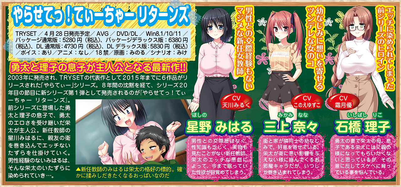 TRYSET最新作『やらせてっ!てぃーちゃーリターンズ』を公式サイトで速報チェック!! エロガキ×女教師のコミカルな学園エロAVG『やらてぃー』が世代交代して帰ってくる!?