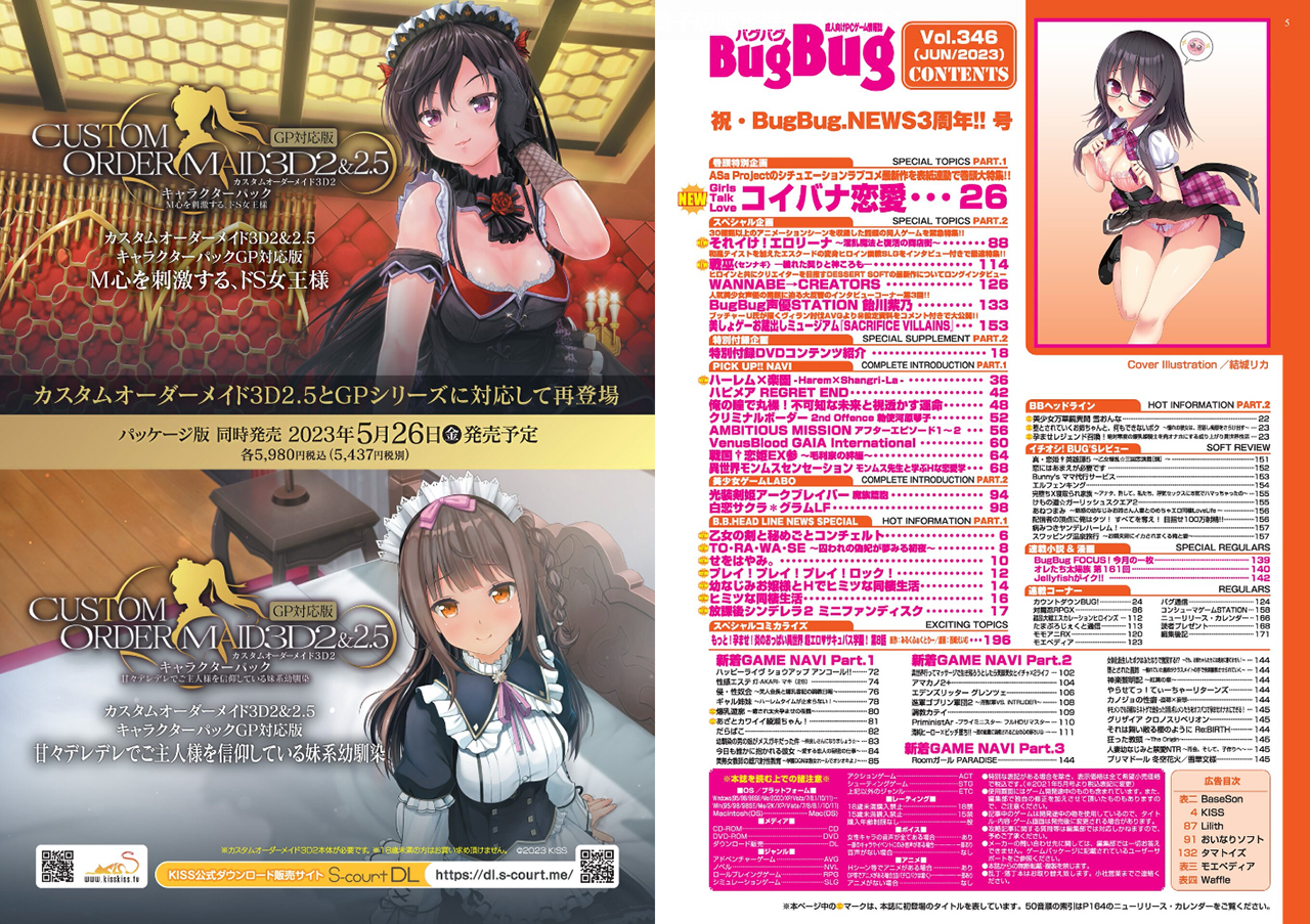 BugBug6月号の電子書籍版は本日発売!! 付録のDVDは付いてないけど、税込1,100円と紙の本よりお手頃価格になっているぞ。スマホやタブレットで、いつでもどこでも、お手軽に美少女ゲーム情報が楽しめちゃうのだ。今号は表紙&巻頭が独占スクープなど、夏休み商戦に向けて期待の新作が超満載♪ 各電子書籍の販売サイトで本の中身の試し読みが出来て、しかも書店によって見られるページが微妙に違っている。色んな販売サイトを回れば、お宝新作情報も沢山チェックできるかも!? なおFANZAでは明日5/11(木)23:59まで「BugBug.NEWS 3周年キャンペーン」を実施中。BugBugのバックナンバーが80%OFFだったりコミックスが60%OFFだったりと超お得なので、是非チェックしておこう。