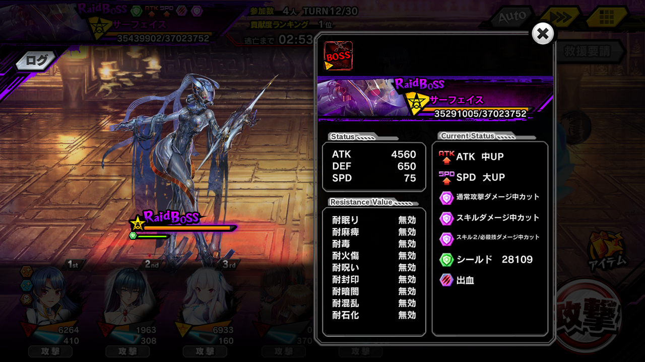 ▲レイドボスはサーフェイス。これは魔界級なので、HPが頭悪いくらいある。ダメージカットとシールドで、奥義でしかまともに攻撃が通らない。ただそれ意外に厄介な要素はないので、力押しでいいのは楽