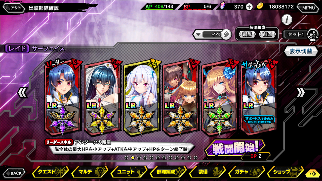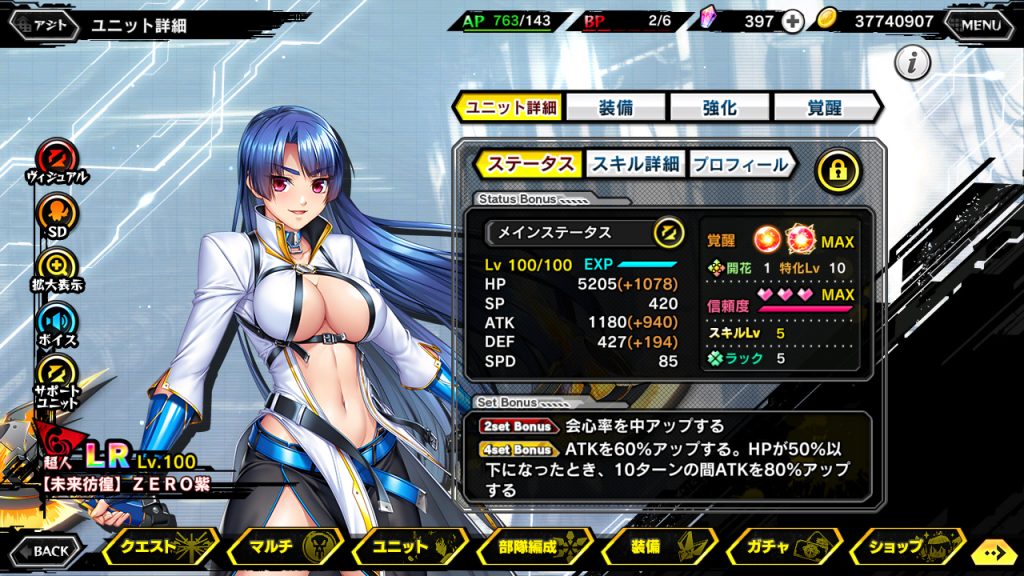 ▲作成したUR累装備も実戦投入して大活躍中。バフのかかってない状態でATKが2000を超える。スゲー