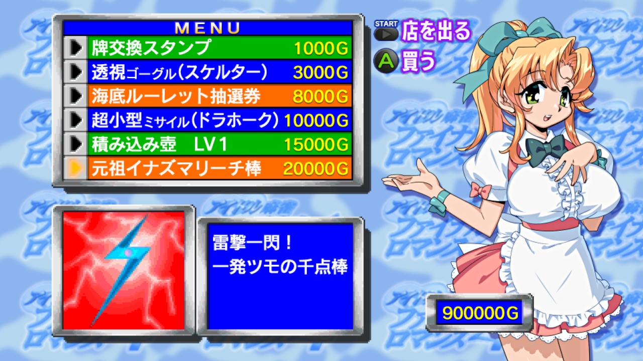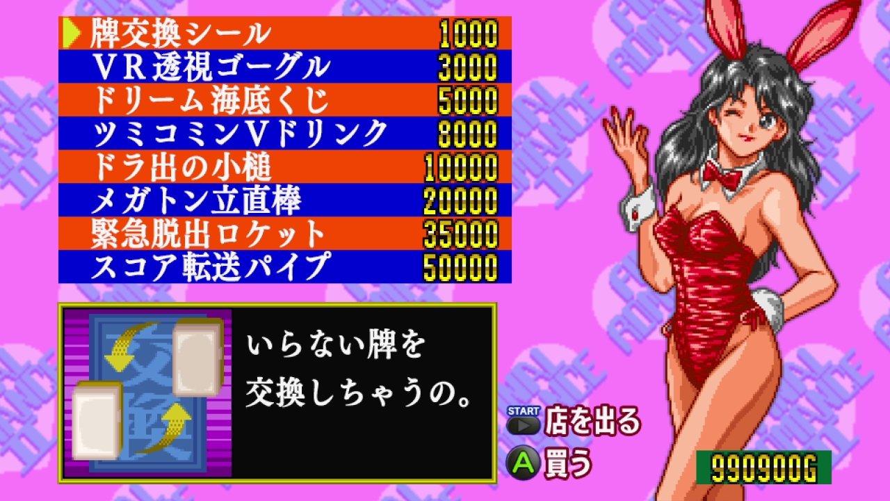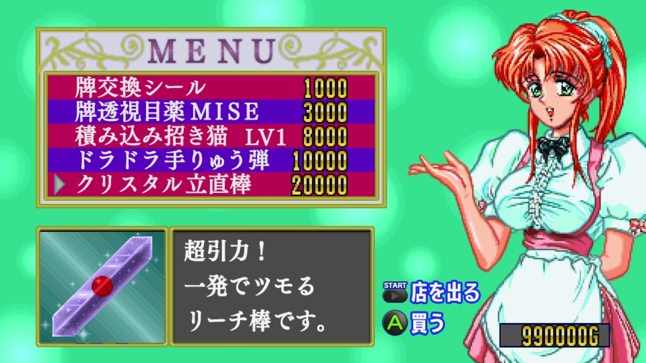▲麻雀部分は正々堂々…ではなく、イカサマありのブッ飛びスタイル。稼いだ資金で積み込みや絶対にツモれるリーチ棒など有利アイテムを購入可能!!