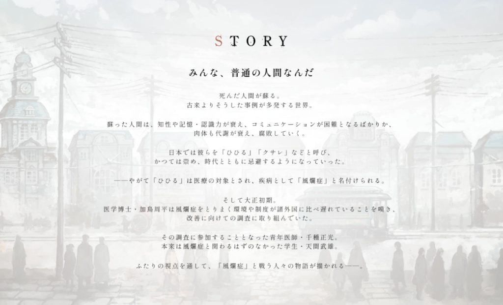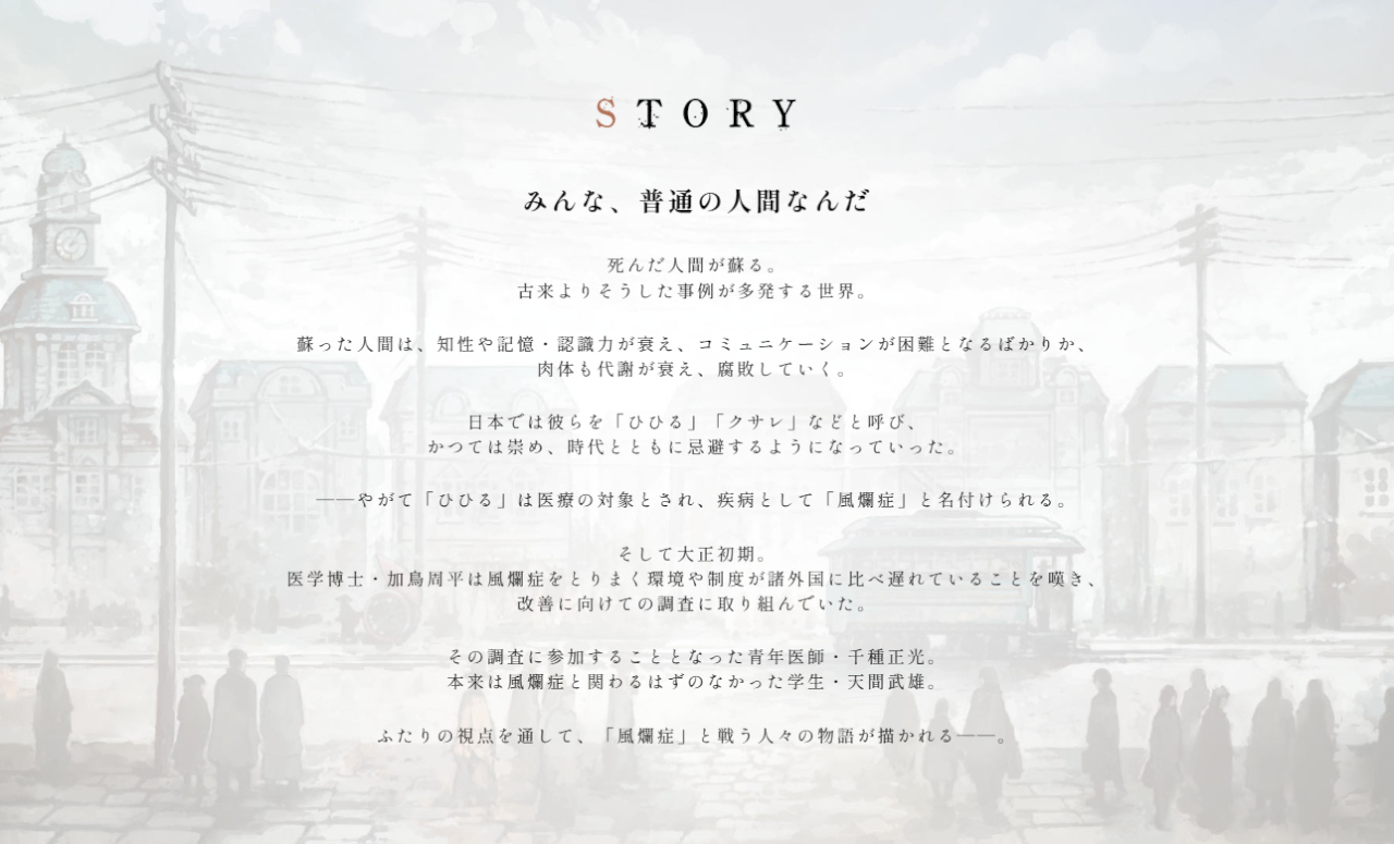 大正時代を舞台に、死者が蘇る風爛症と戦う人々の姿を、ふたりの主人公の視点で描いた『ヒラヒラヒヒル』。本作は『Black Sheep Town』など、数々のAVGを手掛けてきた瀬戸口廉也氏が企画・シナリオを担当し、小説の装画を中心に幅広く活躍するイラストレーターの禅之助氏を起用するなど、豪華スタッフが集結した一般作品だ。スクリーンショットや体験版も発表されている、公式サイトの情報をチェックしていこう!!