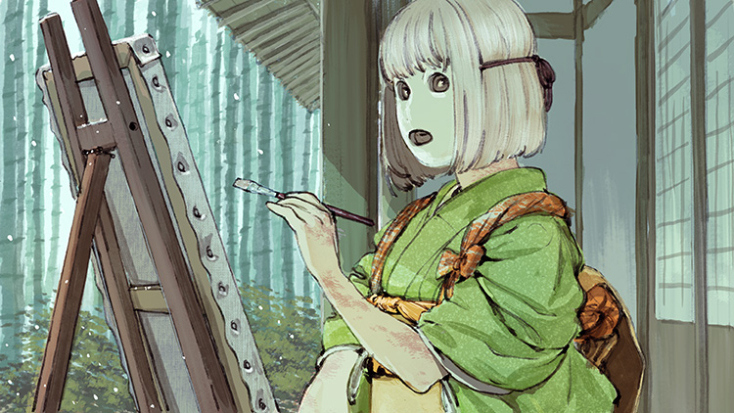 ▲新進気鋭の画家、野村朝。風爛症患者であり、症状のあらわれた顔を隠している