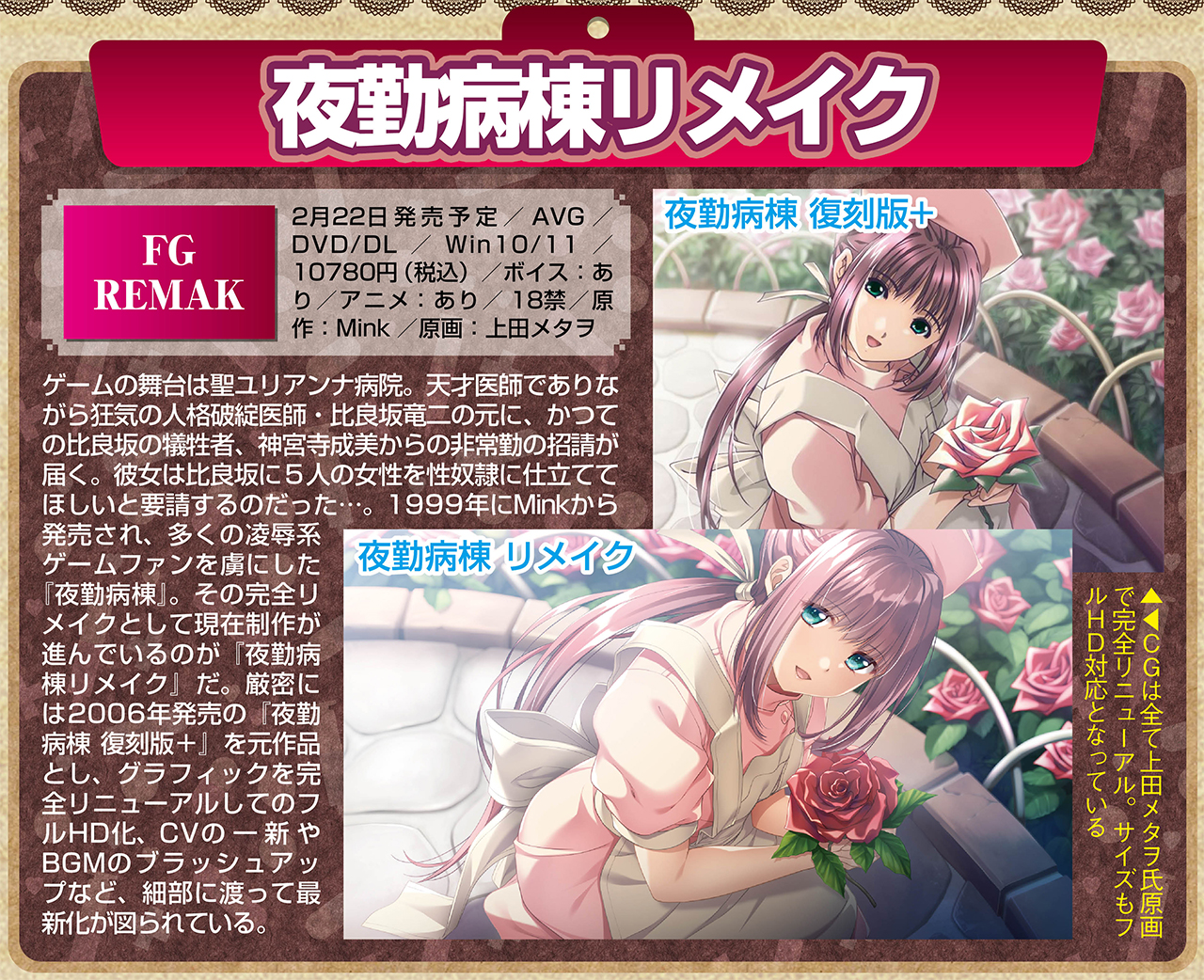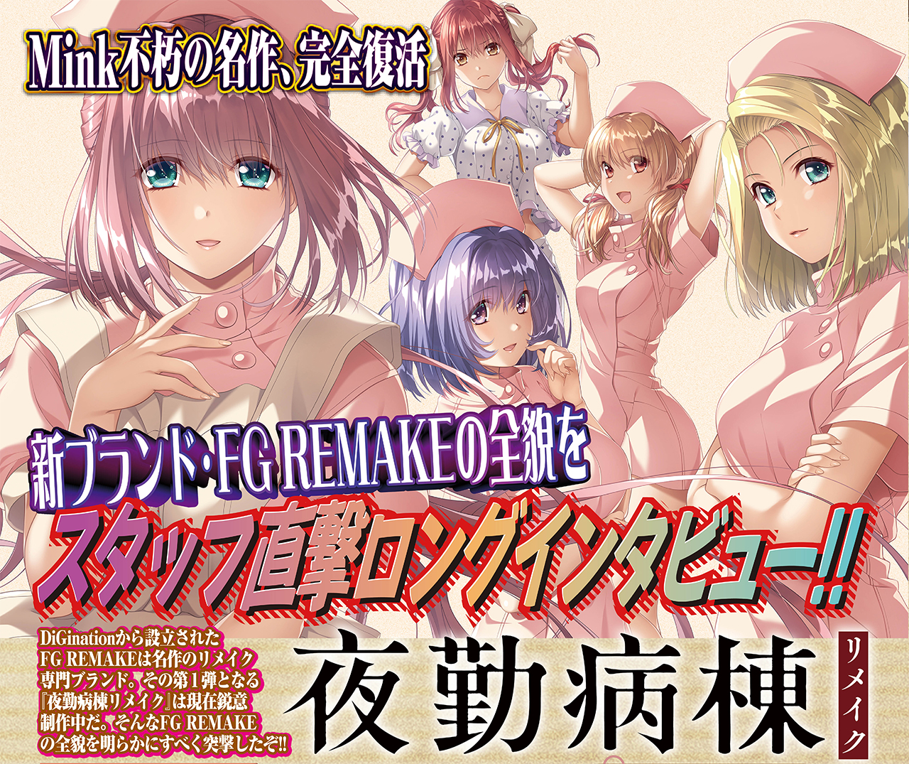 リメイク専門ブランド・FG REMAKEはDiGinationから設立されたブランドだ。まだ誕生したばかりと言うことで色々と知りたいことはいっぱいだが、まずは第一弾タイトルとして2024年2月22日発売に向けて鋭意制作中の『夜勤病棟リメイク』についてBugBug1月号では、プロデューサーの翔P氏と原画の上田メタヲ氏に突撃インタビューでお話を伺ったぞ!! ここではその一部を紹介しよう。