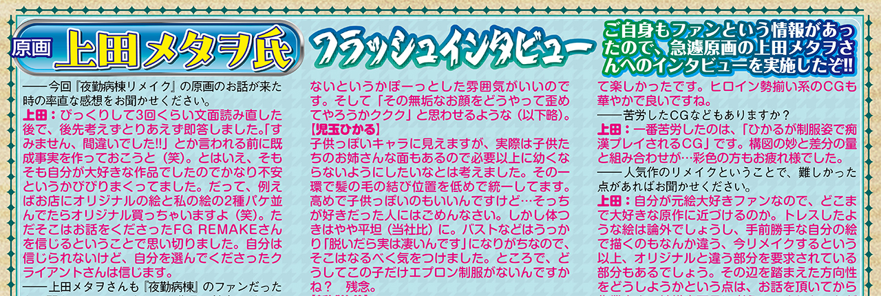 翔P氏とのインタビューの中で『夜勤病棟』のファンだという情報があった上田メタヲ氏にもインタビュー!! 噂にたがわぬ高いモチベーションとテンションで答えてくれたぞ!! ここではその一部を紹介しよう。各キャラクターについてのコメントなどは本誌で確認してね!!