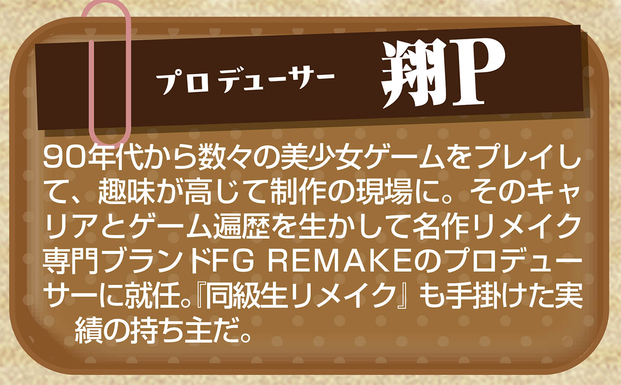 翔P:これは個人の想いでもあるんですが、美少女ゲームを辞めてしまった人に戻ってきてほしいんです。そのきっかけにリメイク作品がなれればいいと思っています。その上で今のゲームのクオリティーに触れてもらって、他のゲームに手を伸ばしてもらえればベストですよね。