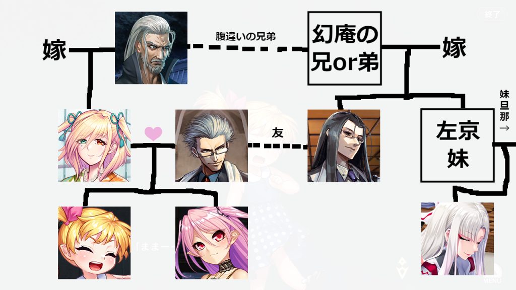 ▲心願寺家は結構複雑なので、改めて以前に作った図を掲載しておく。幻庵の腹違いの兄弟の息子が、左京。その妹の娘があずさだ。紅はフェリシアが妹であることを知らないが、ブラック様はどうなのだろう? 知ってそうな気はするが……