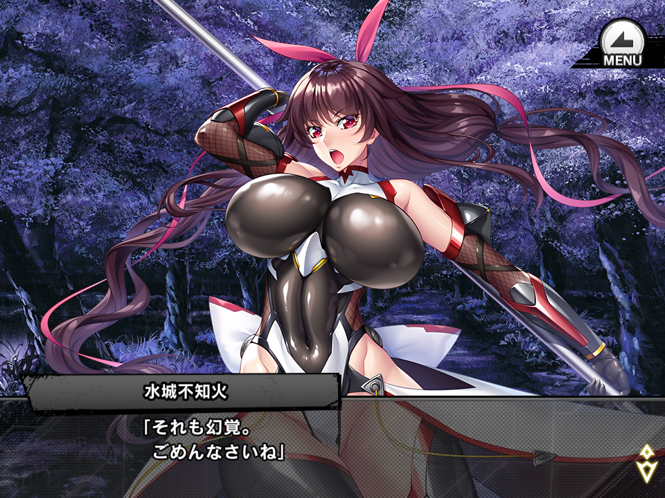▲現在は青白い肌に角も生えた、魔族らしい姿になっている。個人としては慈愛に満ち溢れた人物だが、対魔忍としてアサギを支えていた幹部という経歴もあり、厳しい側面も持つ。「闇の世界からあらゆる不義を討つ」という大義に生きており、そのために娘や五車を捨てた正義の人である