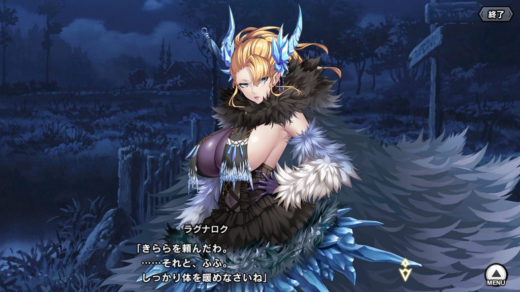 ▲ラグナロクというのは、「霜の鬼神の統一王」という意味。かつての偉大な統一王の名がそのまま使われている。彼女がきららの前に姿を現したのは、霜の鬼神と敵対する死霊卿がきららを狙っているため。みずからの手元で保護しようと迎えにきて、過去の経緯をすべて説明してくれた