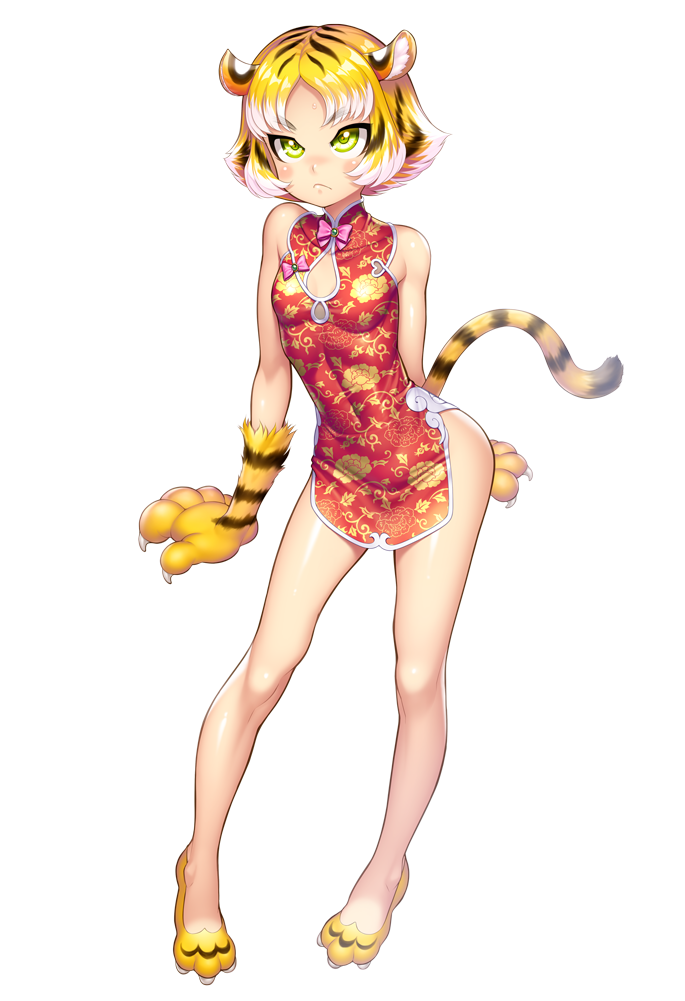 ▲東京キングダムのギャング、獣王会に所属する虎の獣人。獣人形態に変身すると、強靭なパワーと再生能力、咆哮による束縛効果を使える。あと最近では、完全に白虎の姿になる神獣形態にも移行できる。ギャングの面々からは末の妹のような扱いで可愛がられているが、実際はのんびりした男どもよりトラジローのほうがよほどしっかりしている。兄貴分のボス、灰狼一郎太が蛇子にデレデレしているのが気にくわない。口癖は「うんこ」。この服は、ヨミハラにある中華料理屋、味龍でアルバイト中の格好である