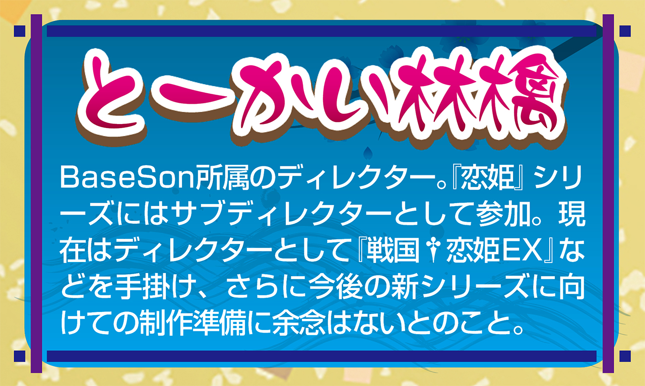 とーかい林檎:BaseSonの代表作として『恋姫†夢想』がありますが、ご存知の通りこのゲームは三国志演義をモチーフにしています。このシリーズを展開していく中で、スタッフの中で「次は日本の戦国時代でこういうゲームを作りたい」という気持ちが大きくなってきまして、それで『戦国†恋姫』が立ち上がりました。当時は『恋姫†夢想』のファンからも「次は戦国時代で」という声も上がっていましたし、今思えば必然だったのかなとも思っています。