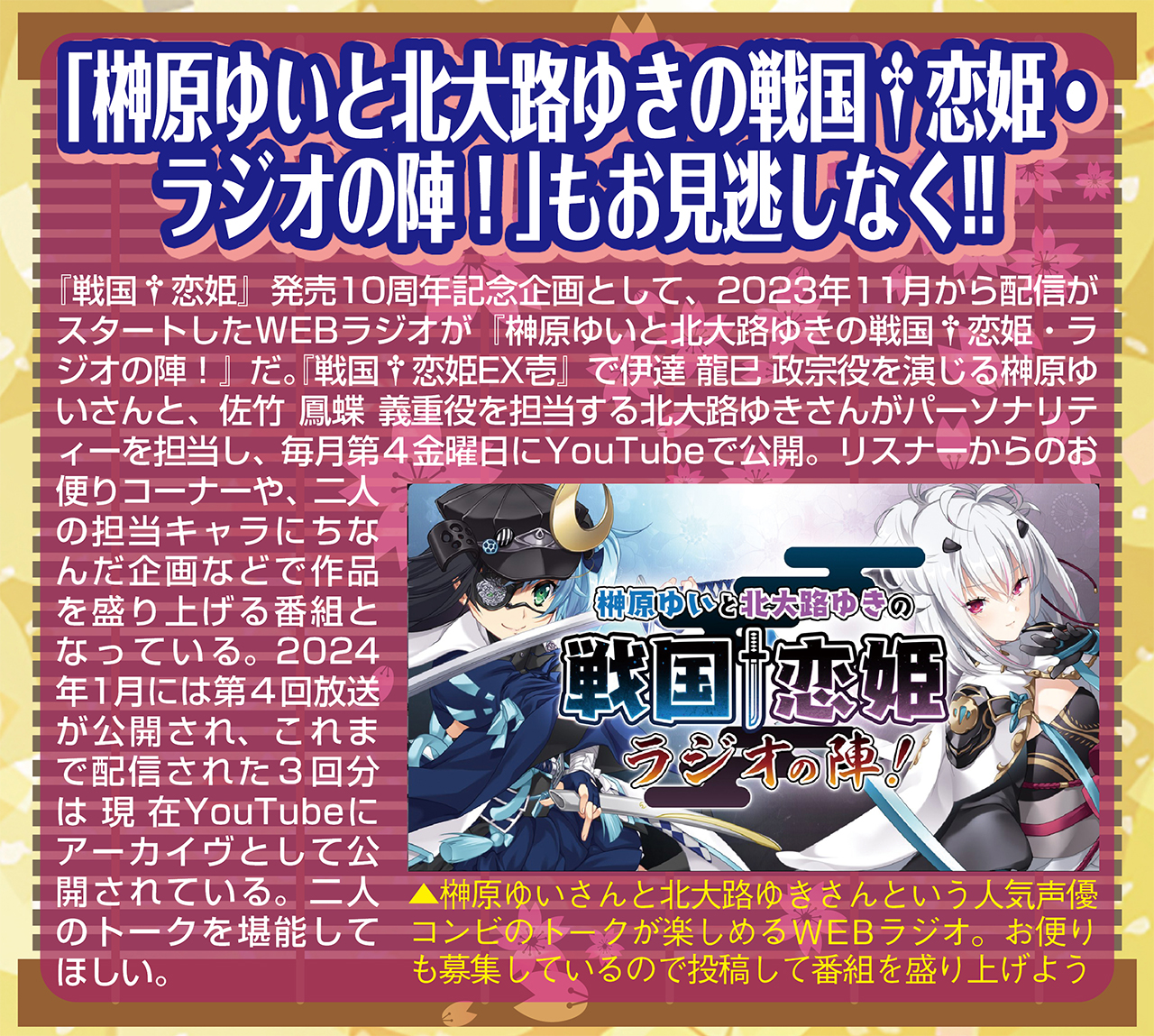 ▲10周年記念企画でWEBラジオ『榊原ゆいと北大路ゆきの戦国†恋姫・ラジオの陣!』も配信中!! 龍巳役の榊原ゆいさんと鳳蝶役の北大路ゆきさんがメインパーソナリティー、さらに毎回『戦国†恋姫』に出演されている声優さんをゲストにお呼びしてのトークは必聴♫