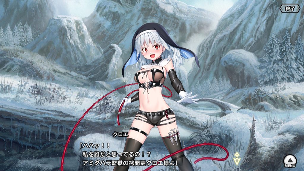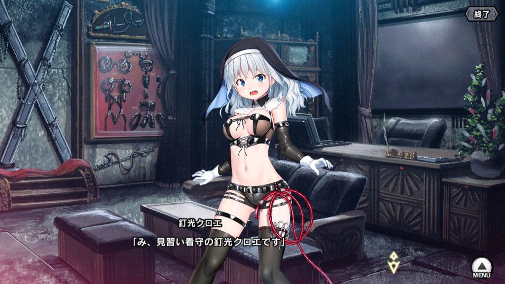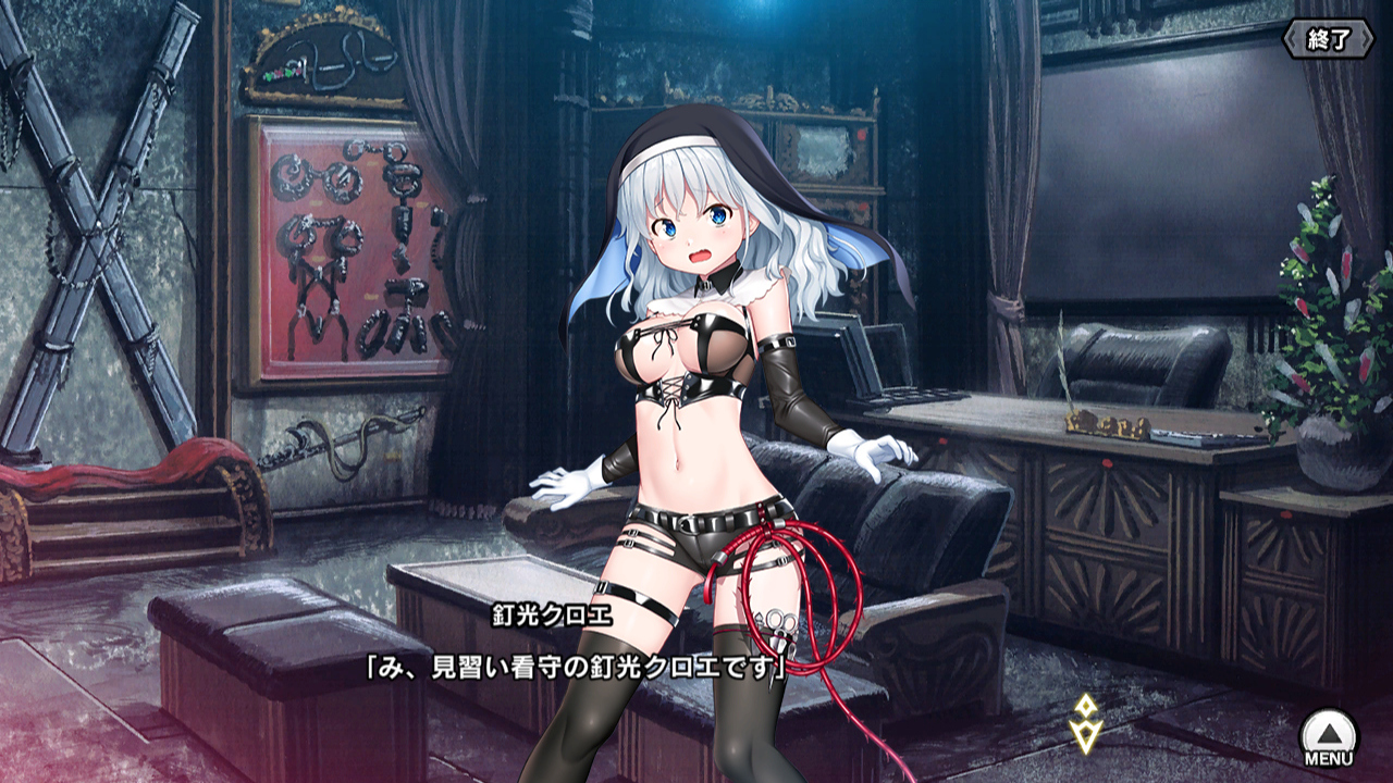 ▲"開遁の巫女・魅神千都"の報酬は、SR釘光クロエ。シスターみたいなベールを被っているが、アミダハラ監獄の看守で、拷問担当である。いつもはビクビクしているが、追いつめられてメンタルが振り切れるとハイテンション&ドSな性格が前面に出てくる