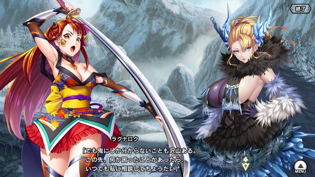 ▲ドヴァリンが住んでいるのは魔界の寒冷地帯で、霜の鬼神の縄張りだ(小太郎たちはアミダハラの魔術師、ノイにテレポートで送ってもらった)。案の定、霜の鬼神に襲われるが、ちょうどその場にいた顔見知りのラグナロクが取りなしてくれた。彼女は娘のきらら(フレイヤ)と同じ、鬼と人間のハーフであるもみじを気にかける