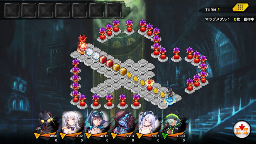 ▲レアマップはハート型……に鍵穴かな? 部隊は適当。黒猫先生のリーダースキルによる追加ゴールドメダルドロップは、マップイベントでは効果がない