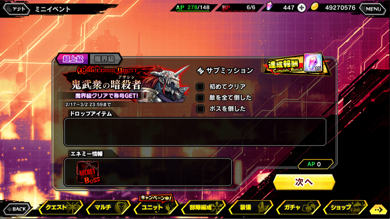 ▲マップイベントは簡単なので周回すればいいだけなのだが、問題はこっち。チャレンジクエスト~鬼武衆の暗殺者~だ。超上級の椿隠形鬼は精神部隊を組んで、HP回復薬とかSP回復薬、なんなら蘇生石を使えば問題ない。クリアすれば、対魔石15個が手に入る