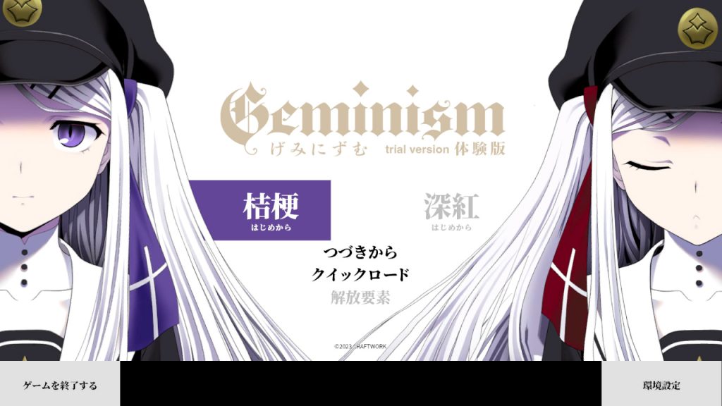 CRAFTWORKと言えば狂気的な内容でカルトな人気のあった『さよならを教えて』をリリースしたブランドです。筆者も同作品をプレイして精神的ダメージを負いましたが、不思議と印象に残る作品でもありました。そんな「普通じゃない」ものを作り出すブランドから待望の新作が登場です。どうやらヒロインである桔梗と深紅の双子姉妹が殺し合う内容みたいですが…? ちなみに桔梗と深紅は互いに自分の事を「姉」だと言っており、そこに何か意味が隠されていそうですね。色々と気になるので体験版をプレイしてみました!!