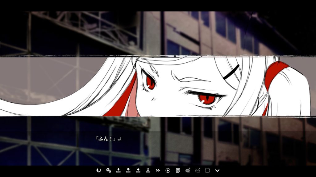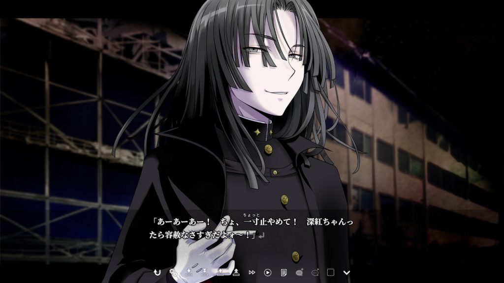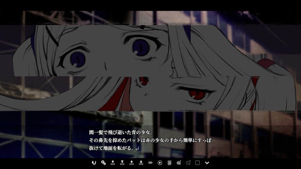 いきなり桔梗と深紅が殺し合いをしているシーンからゲームは開始されます。どうしてそうなったか…みたいな状況説明は一切ナシで、その辺りはストーリーが進めば明かされるタイプでしょうか? 注目すべきは演出で、一般的なAVGだと会話シーンは立ち絵が表示されますよね。しかし本作はカットインが多用され非常にテンポよく会話が進み、迫力のある戦闘シーンを楽しむことができるのですよ!! またヒロインの姉妹以外に二人の怪しい男が登場するのですが、なかなかクセの強い人物で物語にどう絡んでくるのか気になります。