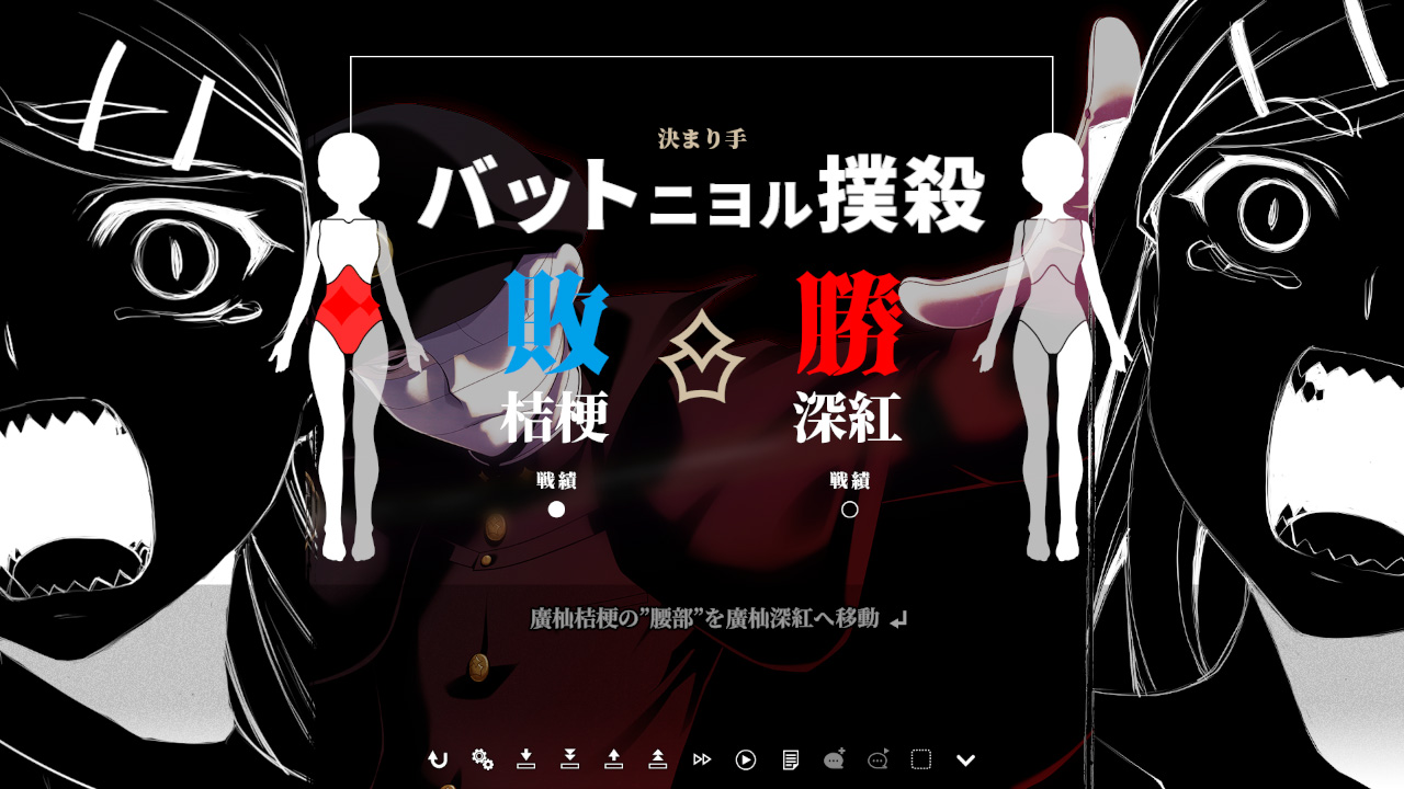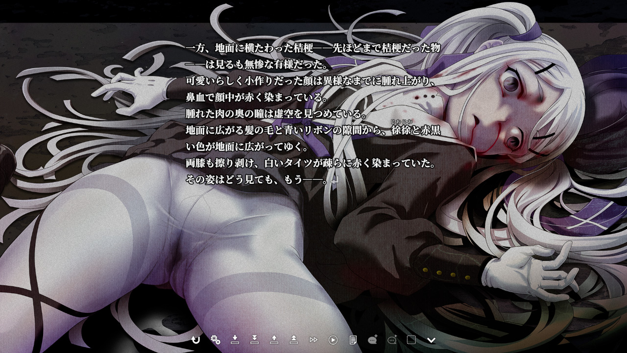 ついに双子姉妹の戦いに決着がつくのですが…桔梗に馬乗りになった深紅が何度もバットを振り下ろすという、エグい描写をテキスト&CGで見せてくるのが強烈!! その後に出てくる桔梗の死体(?)のCGも凄惨で、さすがCRAFTWORK作品と言うべきか…。もっとも桔梗はすぐに蘇生するのですが、敗者は勝者に身体の部位を取られるという衝撃的な展開に!? どうやらこの殺し合い「仕會わせ」とは、互いに欠損した身体の部位を奪い合うもののようです。とんでもない物語だった!! 最終的に身体を全て奪われたらどうなるんでしょうね?