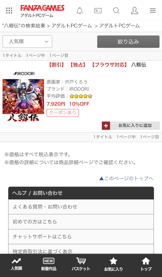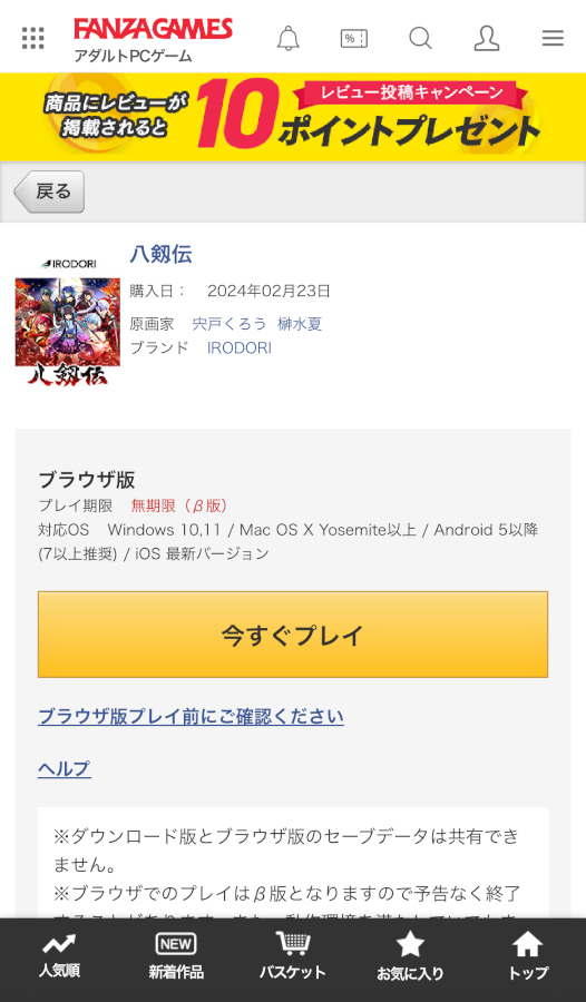 ここからはブラウザ版をプレイするまでの手順を説明していくぞ。事前に必要なのは、FANZA GAMESのユーザー登録のみ。あとはクレジットカードを手元に用意すれば、すぐに購入可能だ。今回紹介した『八剱伝』を例に解説していこう。ちなみに購入しているのはダウンロード版で、それにおまけとしてブラウザ版が付属している形である。もちろん購入後、PCにダウンロード版をインストールして遊ぶことも可能だ。ただしダウンロード版とブラウザ版のセーブデータは共有できないので、そこは注意しよう。