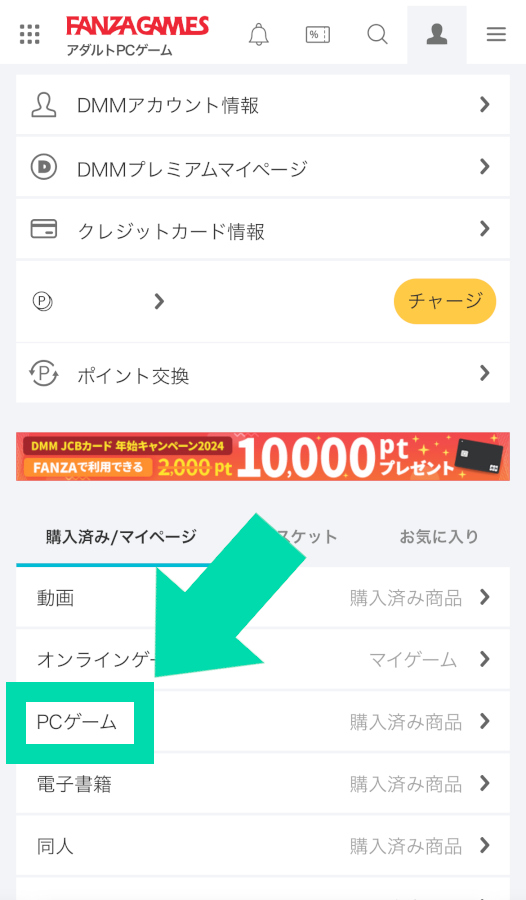 ▲購入完了したら、検索に使った虫眼鏡アイコンの右にある、人の頭みたいなアイコンから、「購入済み/マイページ」の「PCゲーム」をタップ