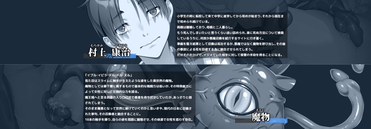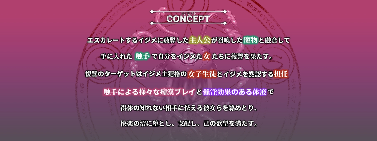 アングラなエッチゲーを作りまくるシルキーズSAKURA待望の最新作は新機軸の触手モノ!! 魔物と融合しちゃった主人公となり、自分をいじめてきた女性たちに触手でエッチな復讐を果たしていくことが目的なのだ。触手に怯えさせ、快楽の底なし沼へとたたき堕としていく、エッチ的にも復讐的にもウルトラスッキリできちゃうから、性欲とストレスの両方解放できてお得すぎ♪ 触手好きなら絶対チェックすべき逸品だぞ!!