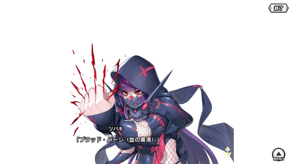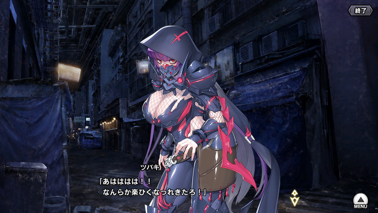 ▲"ツバキとヨーコ"の報酬ユニットは、SR麻藤陽子。シナリオのメインのひとりとして、ヨミハラから魔界に渡って活躍する。スケバン対魔忍を名乗り先輩に敬意を示す、勢いのある人格は火遁衆っぽいが、忍法は木遁である。見どころは後で紹介する夢のシーン