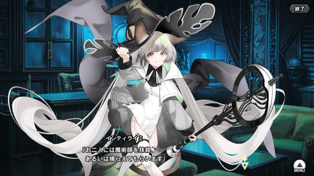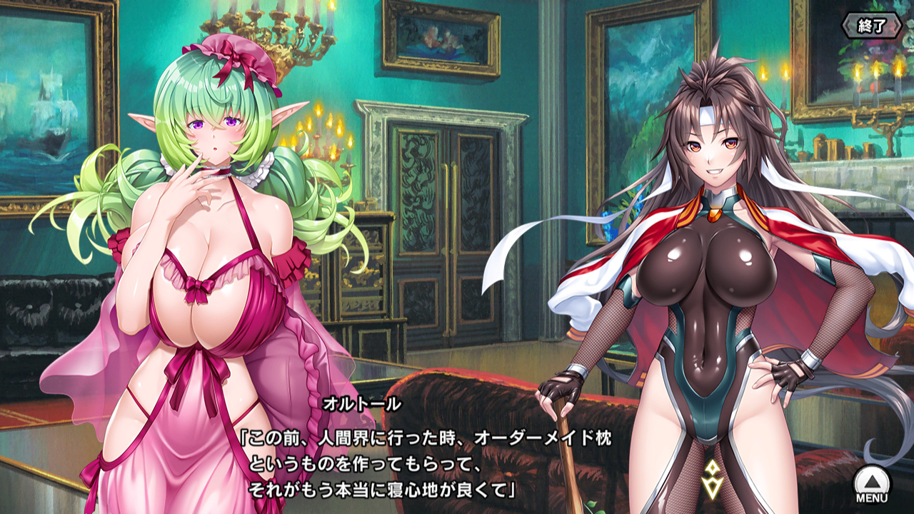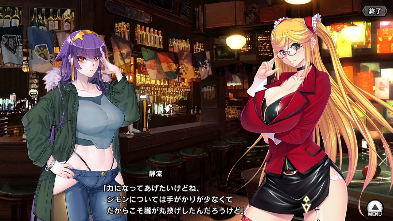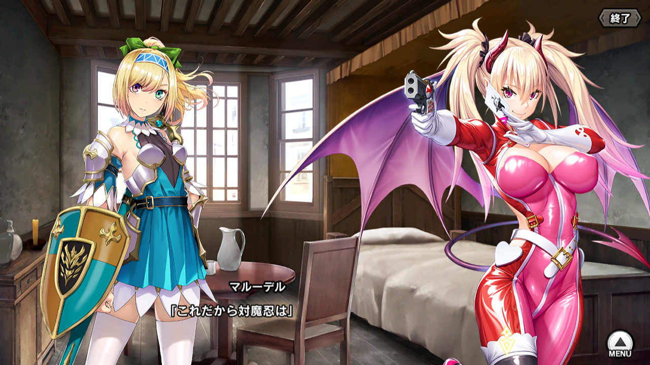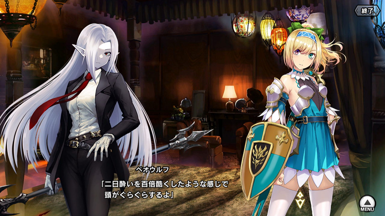 ▲メニューの下のアジト画面は、レポートの100回記念に使用したリーナとイングリッドの師弟イラスト