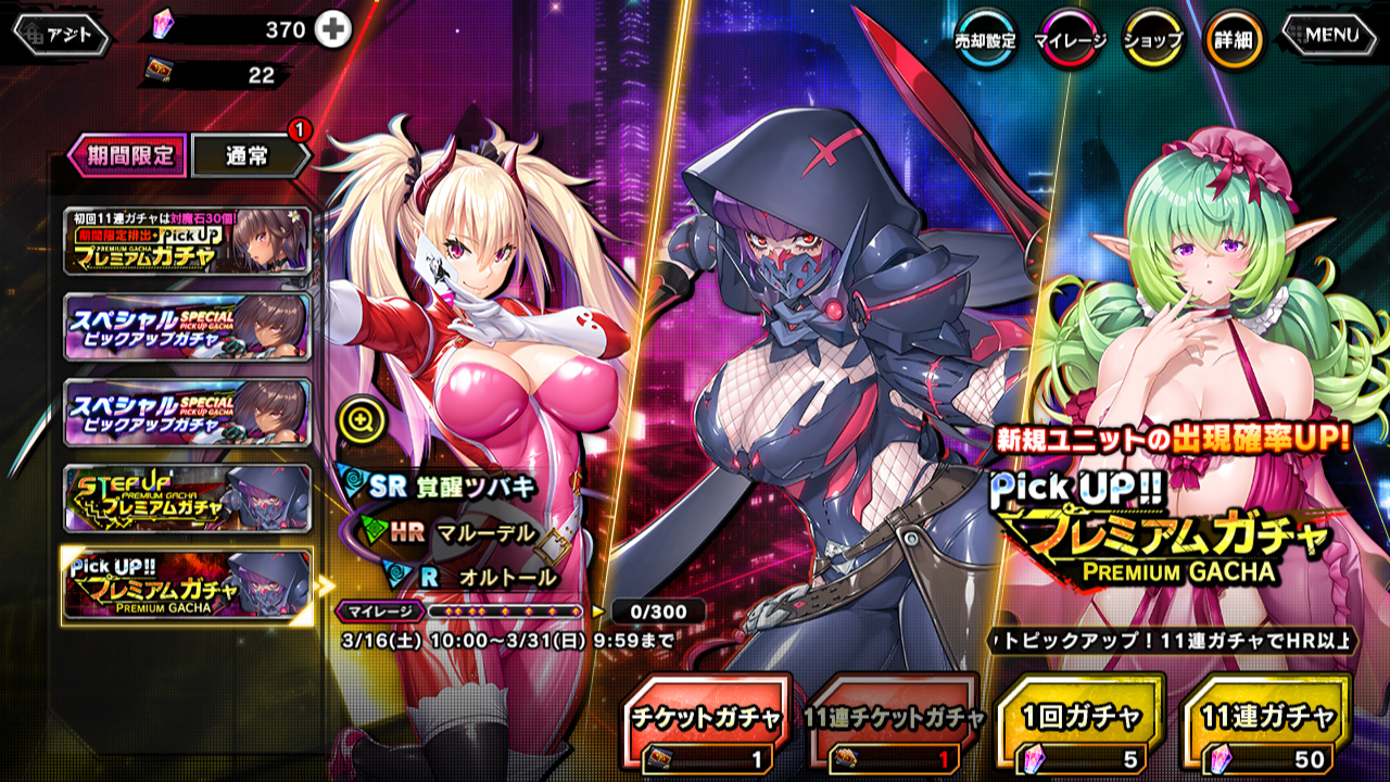 ▲覚醒ツバキ、マルーデル、オルトールが追加されたピックアッププレミアムガチャも開催中だが、さすがに五車祭前の今はスルー。覚醒ツバキは敵のATKデバフした値を自身のATKに変換する面白い魔性のアタッカーなので欲しいけど……