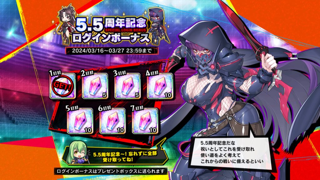 ▲5.5周年記念ログインボーナスとして、ツバキが大量の対魔石をくれる。ありがたい。それと別に5.5周年限定感謝御礼プレゼントとして、対魔石55個+SR確定ガチャチケットも配布された。ありがたい。SR確定ガチャからは朧が出た。帰れ