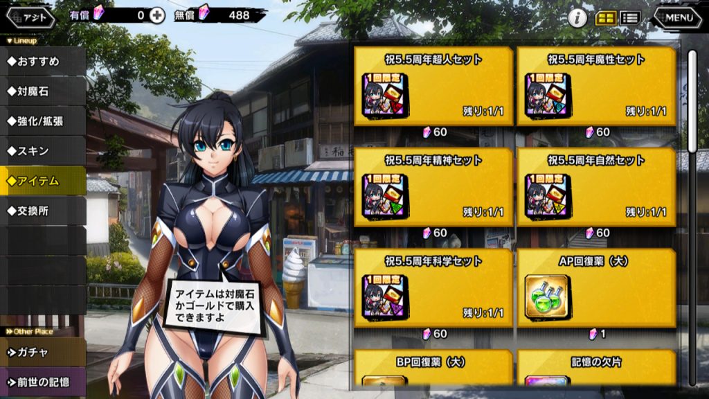 ▲あとは5.5周年セット、5.5周年ミニセットなんかも販売中。ちょっとわかりにくいのは、ショップのアイテムタブで売っている祝5.5周年属性セット。対魔石60個で、各属性のスキルの書(秘伝)と、各属性のSR確定ガチャチケットが手に入る