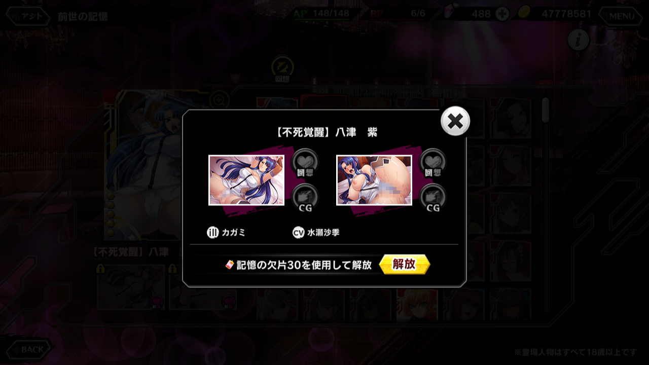 ちなみに前世の記憶で見れるのは、『対魔忍アサギ~決戦アリーナ~』という昔やっていたソーシャルゲームのカードに付随するエッチシーン。カードにはレアリティがあり、SR以上にはシーンがふたつあるため、解放には記憶の欠片30個が必要である。EXと書いてあるのはイベント報酬のカードなのだが、エッチシーンに差はないのでシーンの個数が1個のと2個のがある、という認識で問題ない。