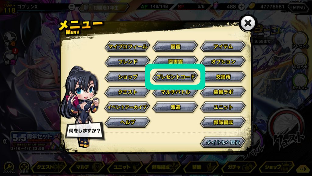 ▲プレゼントコード入力は、メニューの"プレゼントコード"から!!