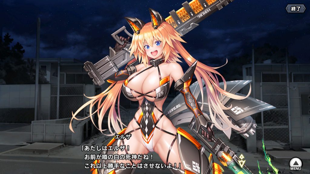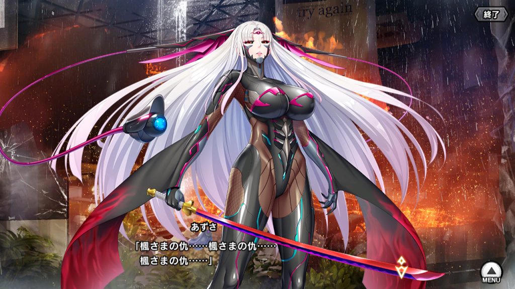 ▲改めて説明しておくと、あずさは恩人である心願寺楓の仇を討つため、特務機関Gと死霊卿を潰そうとしている。ただGの情報を得るためだけに無関係な米連基地で虐殺を行っており、狂人にしか見えない。エルザの隊も犠牲になるが、スズカとアロンダイトの出現によりエルザだけはなんとか生き延びる