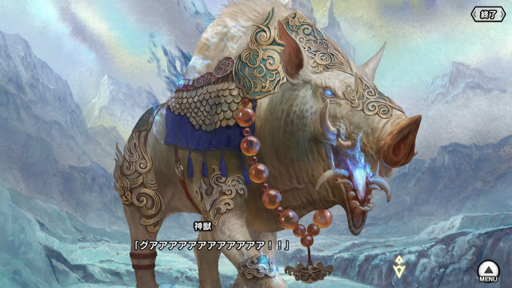 ▲凜子はそんなあずさを止めるため、心願寺の御山で神獣を倒し、神眼を得ようとする。神獣のビジュアルは新春の福猪・清麻呂。定期的に出てくるな、お前……
